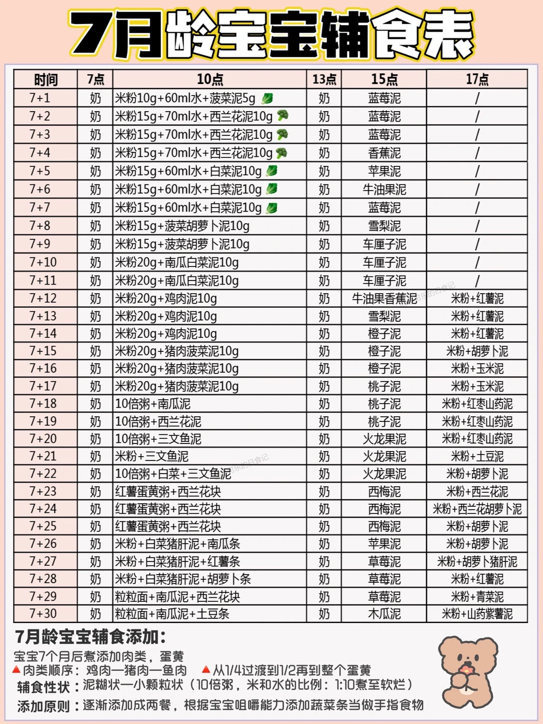 每天奶量600毫升以上,这个月可以从泥糊状过渡到颗粒状的辅食了,跟6月不同的是可以添加2餐辅食了,猪肝粉是我7个月才给宝宝添加的,爷爷的农场猪肝粉含铁量高达385mg,是二价铁,一点也不腥,宝宝容易接受,小袋包装用起来很方便~