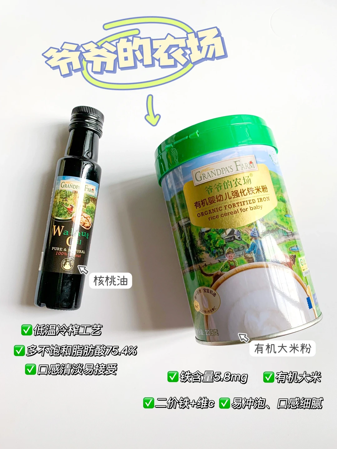 宝宝吃米糊一周后可以添加核桃油,我家吃的是爷爷的农场,口感清淡,不多饱和脂肪酸含量高达75.4%,加在米粉里还有淡淡的核桃香