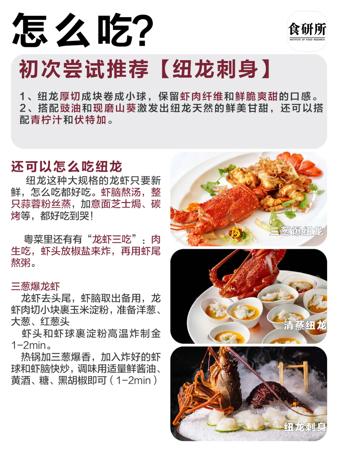 纽龙这种大规格的龙虾只要新鲜,怎么吃都好吃。虾脑熬汤,整只蒜蓉粉丝蒸,加意面芝士焗、碳烤等,都好吃到哭!粤菜里还有有“龙虾三吃”:肉生吃,虾头放椒盐来炸,再用虾尾熬粥。