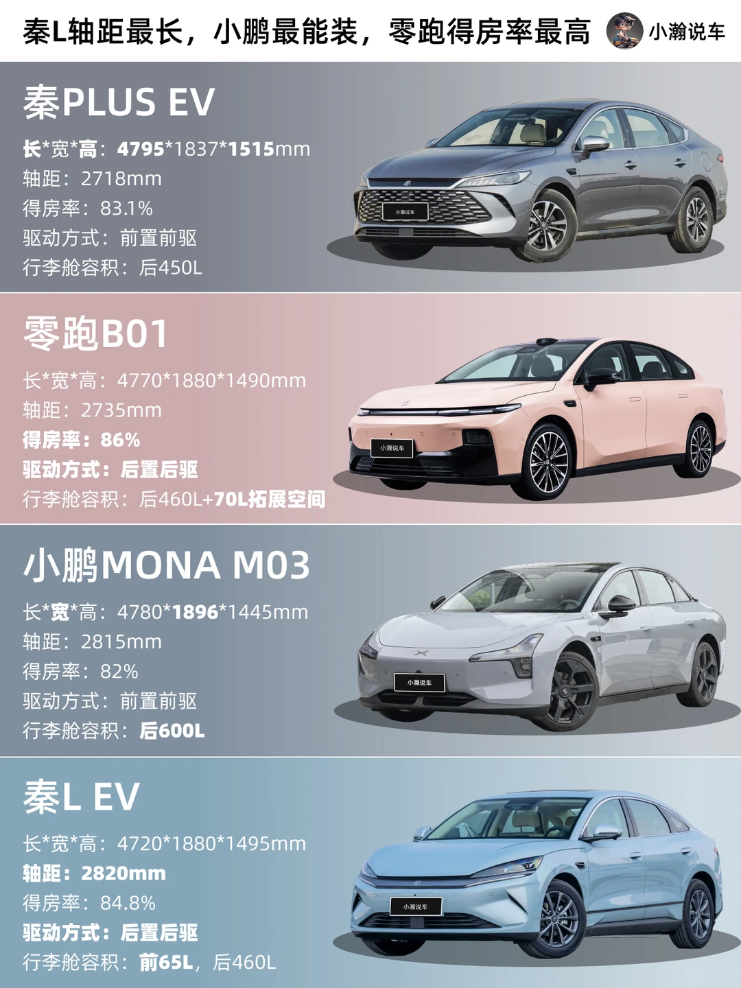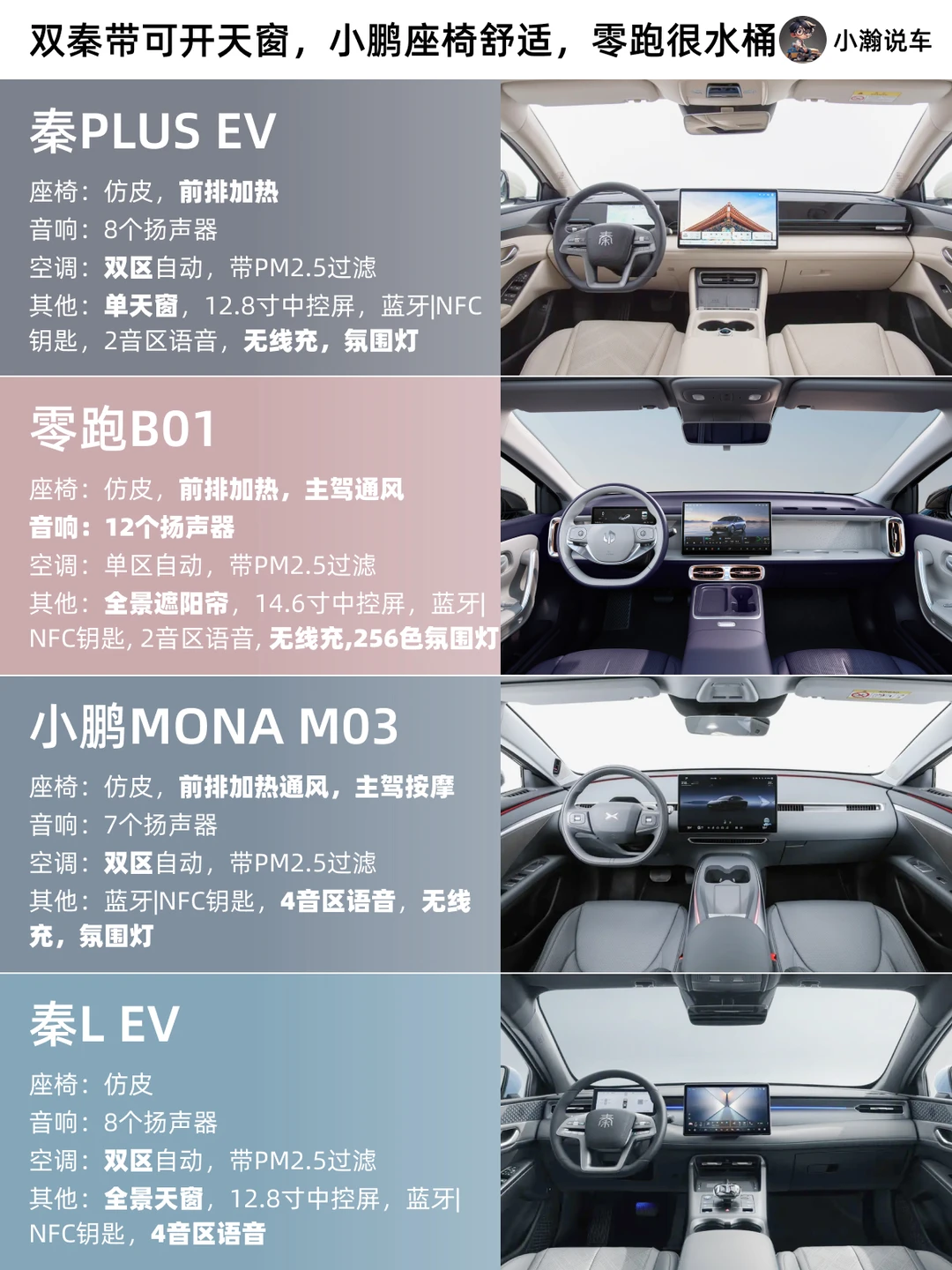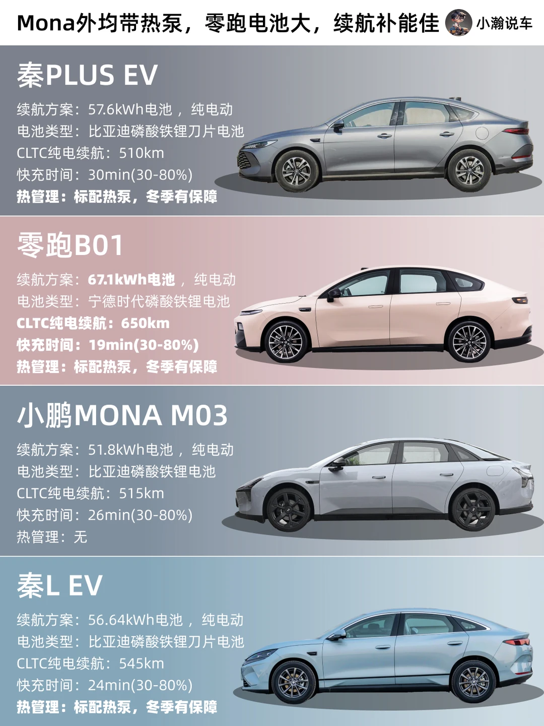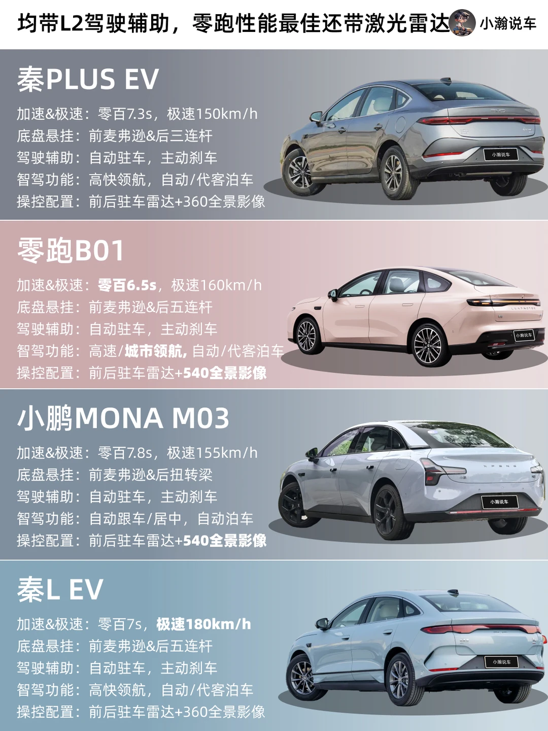 如果你现在手握12万预算想买纯电轿车,零跑B01、小鹏MONA M03、比亚迪秦Plus EV 和秦L EV肯定是目前市场上的热门选择。这四款每一款的优势究竟是什么?小瀚今天就从续航、辅助、底盘到配置4个维度,一篇帮你理清楚!