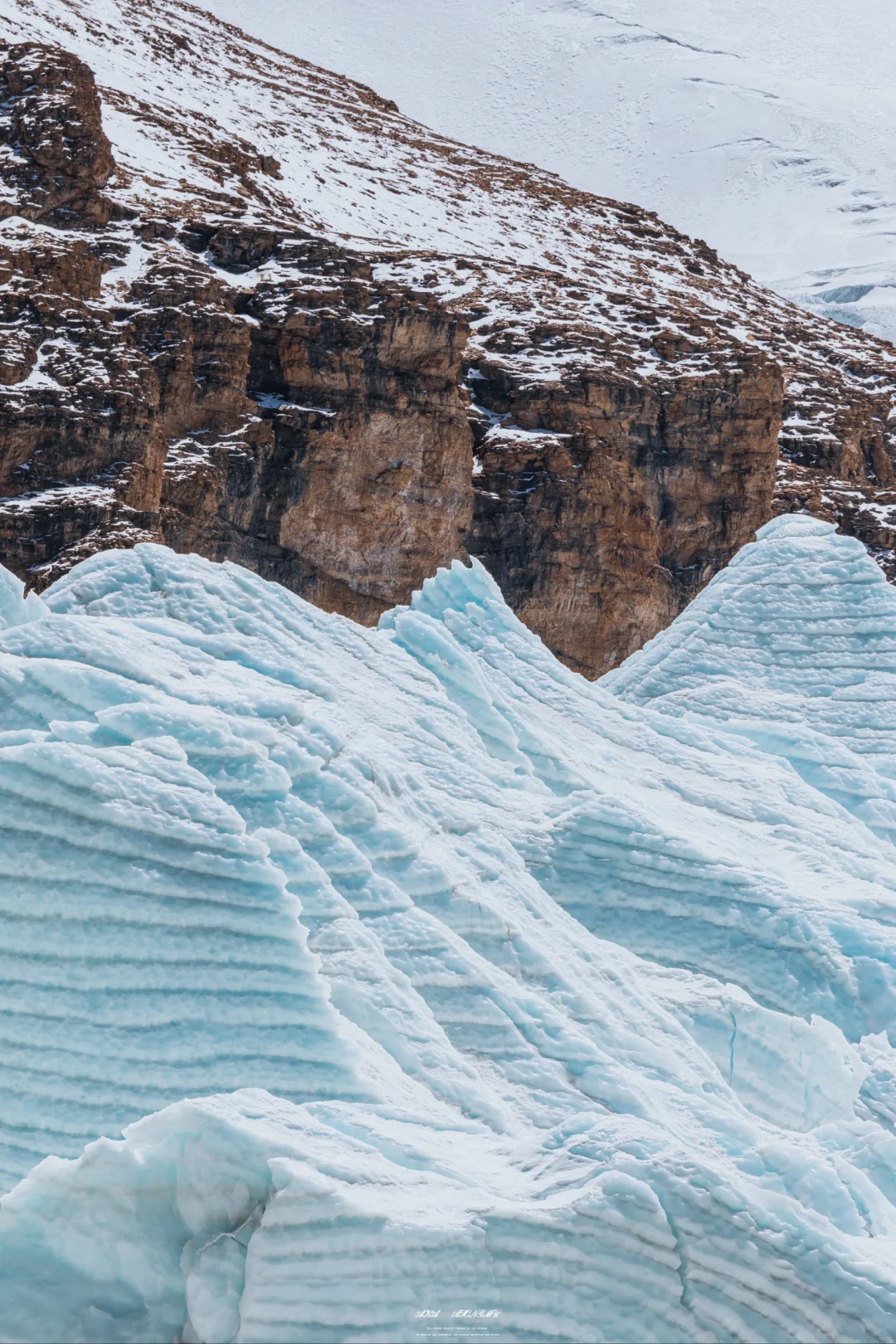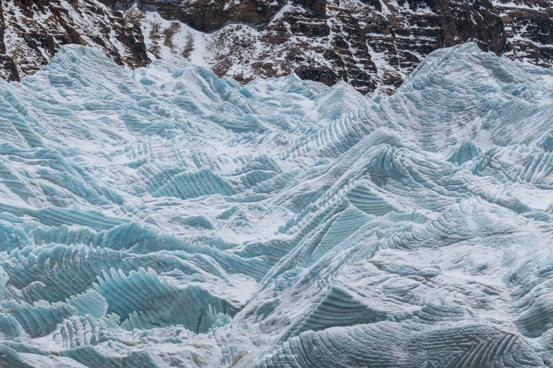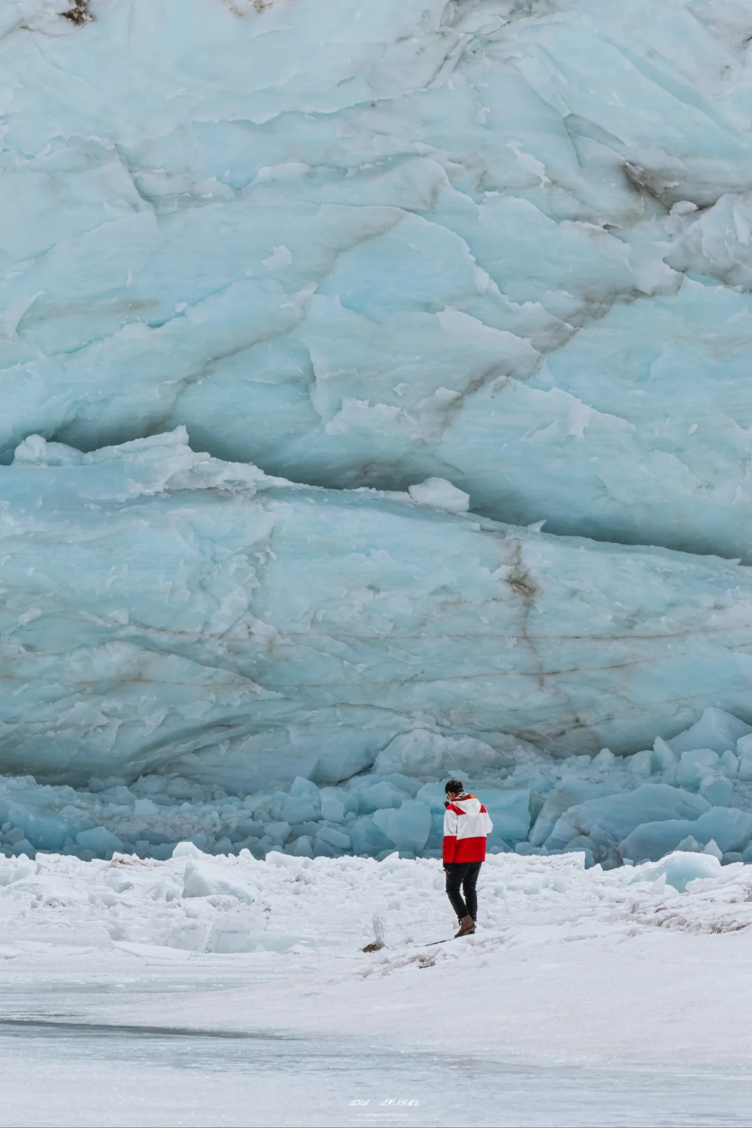 休息片刻继续前往冰湖的尽头,冬天来这是可以从湖面走过去的,我去的时候已经开始解冻,只能从一侧绕过去,这里还需要1个小时左右的路程,好在不需要爬坡,小心脚下就可以,行走时会听到冰面传来砰砰冰裂的声音,有时候会吓你一跳,等到直面这远古冰川的一刻,真的觉得一切语言都是词穷的,散发着幽蓝光芒的冰壁伫立在前方,仔细看上边还有着像树木年轮一样的纹理,层层叠叠,周而复始,记录着冰川的年龄,时间关系我只去了铜湖冰川,如果你去过旁边的58冰川和玉湖冰川,那就把照片放到评论区吧
