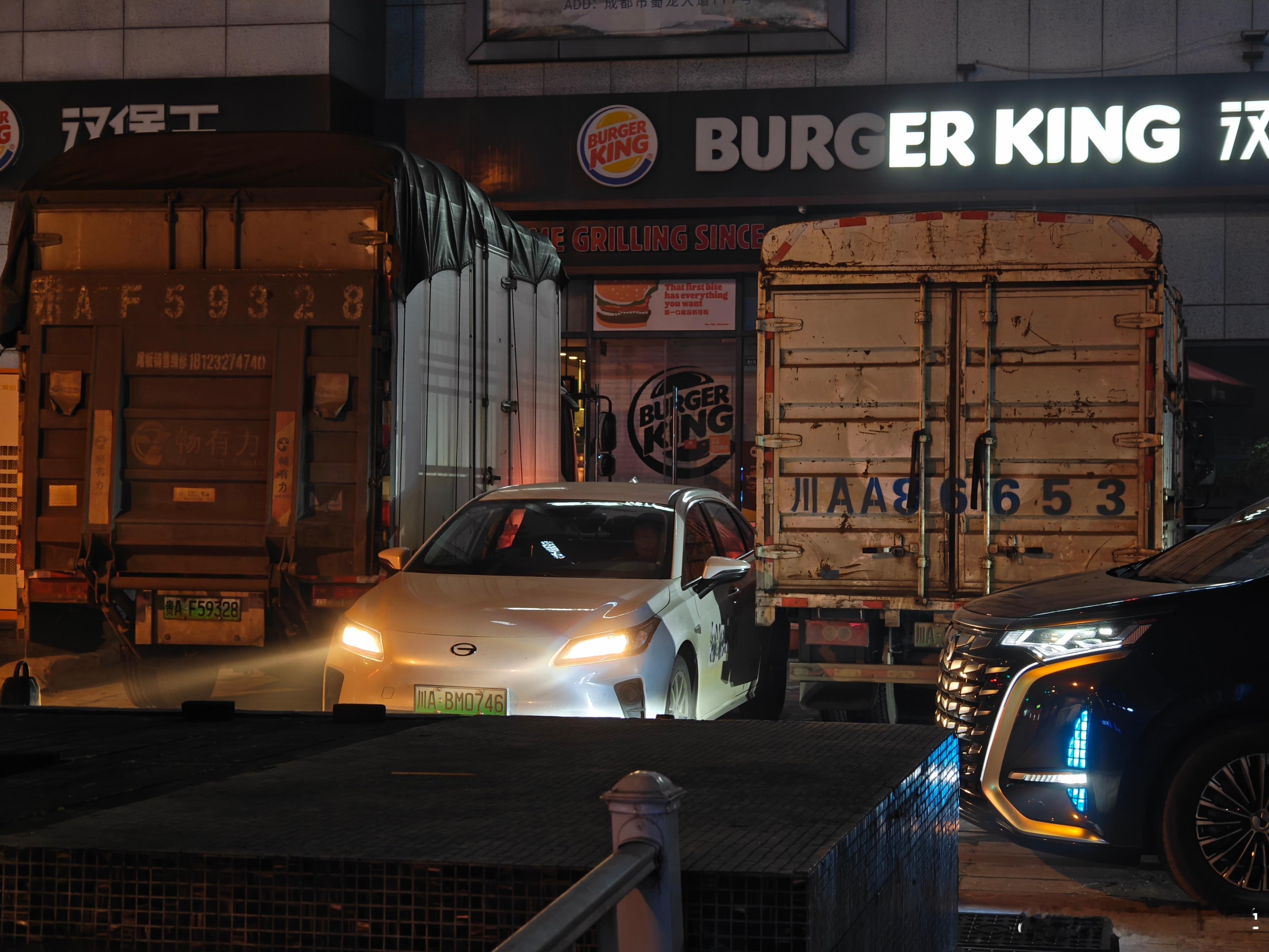 晚上10点过充电站一幕:一辆小车被两个大货车夹在中间,根本倒不进去,只能用这种方