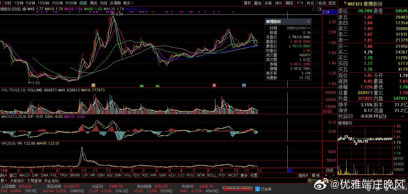 【财富晚茶】三元股市收评:沪指涨0.65%:旅游强势上扬轨交探底导语:作者系《网易号》优质财经领域创作者。曾经原创作者和知名网易号旅游领域创作者。大跨度行业等的写作,颇受网友喜爱。作品发表于2025.12.01.15:18优雅端庄晚风。(标题作品:全球最佳旅游景点之一:日本东京)一、雅博股份:八年箱底002323 雅博股份 盘中02涨1、八年底部:今年突破今日视野:前期双顶:震荡突破。2025-12-01 截止15:00:收盘股价:1.81元,上涨1.12%。成交总量:668973手。成交金额:1.21亿元。总换手率:3.15%。总市值达:38.00亿元,流通市值:38.00亿元。2、光伏领域:全球领先主营业务:金属屋面围护系统-新能源业务研产和销售。公司品牌:金属围护系统行业内产值三强企业。3、营收良好:净利减亏业绩减亏:2025-03-31 一季度报:公司营收:2.1013亿 同比增11.49%,实现-6031.4086万 同比增5.74%。二、多空搏杀:沪深红盘1、追踪盘面:蛛丝马迹沪深场景:早盘:高开三涨,四跌四涨。午盘:四跌三涨,二跌三涨。尾盘:一跌一涨,最高红盘。看点之一:沪深股指:沪指高开:盘中震荡,全线拉升。看点之二:深创指等:涨幅超1%。看点之三:沪深北市:合计成交:18896亿元。场内个股:3398股飘红。2、板块涨跌:风口依然涨跌观察:板块见证。板块拉升:旅游、餐饮、半导体、有色、银行、汽车、石油等。板块回调:轨交、养殖、数字媒体等。概念活跃:消费电子、光刻机、稀土、黄金、存储芯片等。3、技术看盘:涨跌位置观K线提示:精彩多空博弈。12月02日:沪指突破阻力:03914点看涨,前程似锦;跌破支撑位:03890点看跌,日暮途穷。深指突破阻力:13149点看涨,鹏程万里;跌破支撑位:12993点看跌,不堪造就。三、三元板块:风口潜水1、追踪盘面:视角视野三元强势,沪深脉冲。72股上涨,涨幅5%以上:5股涨停板。37股下跌,跌幅5%以上:1股跌停板。涨幅0%:14股0停板。涨幅0.00%+上涨个股:14+72=86股票赚钱。沪深两市:合计成交18896亿元。总体归纳:三元股票:盘口强势。2、追踪盘面:主力进退换位思考:沪深强势,尾盘见顶。沪指距9:31-15:00:前1小时放量盘升,中2小时略量盘升,后1小时略量盘升。深指距9:31-15:00:前2小时放量盘升,中1小时略量盘跌,后1小时略量盘升。沪深两市:合计成交:18896亿元。四、透析个股:聚焦涨跌1、涨幅榜眼:处排查摸主旋律:涨幅榜之中:寻找启动600337 美克家居 000078 海王生物 000669 ST金鸿涨幅榜-1:600337 美克家居主营业务:家具-配套家居的研产和销售。公司品牌:多品牌多渠道一体国际综合家居消费品头部公司。涨幅榜-2:000078 海王生物主营业务:生物生化制品-海洋药物-海洋生物制品-中成药研造和销售。公司品牌:国内实力雄厚综合性大型医药他头部企业。涨幅榜-3:000669 ST金鸿主营业务:天然气。公司品牌:国内最具实力的综合性清洁能源服务商。2、跌幅榜眼:处排查摸主旋律:跌幅榜之中:寻找金子300152 ST新动力 300237 ST美晨 600337 美克家居跌幅榜-1:300152 ST新动力主营业务:节能点火特种装备-燃烧控制系统等工业提供点火产品及技术服务。公司品牌:中国电站动力锅炉自动点火技术的开创者和头部企业。跌幅榜-2:300237 ST美晨主营业务:橡胶非轮胎-园林绿化D 研产和销售。公司品牌:国内外非轮胎橡胶制品重要综供商和头部企业。跌幅榜-3:600337 美克家居主营业务:家具-配套家居的研产和销售。公司品牌:多品牌多渠道一体国际综合家居消费品头部公司。3、潜力榜眼:处排查摸主旋律:潜力榜之中:寻找估值002496 *ST辉丰 300301 *ST长方 000669 ST金鸿潜力榜-1:002496 *ST辉丰主营业务:生物农资-农资电商-石化仓储供应链-项目投资。公司品牌:中国领先亚临界小分子高温裂解工艺高科技专利产品和头部企业。潜力榜-2:300301 *ST长方主营业务:LED照明光源器件。公司品牌:LED照明光源器件头部企业。潜力榜-3:000669 ST金鸿主营业务:天然气。公司品牌:国内最具实力的综合性清洁能源服务商。五、本创作者:优质网易投资投机迷茫之中:给予尽可能有帮助:资本市场风险自负。(优雅端庄晚风《网易号》优质财经领域创作者和原创作者; 违者必究)