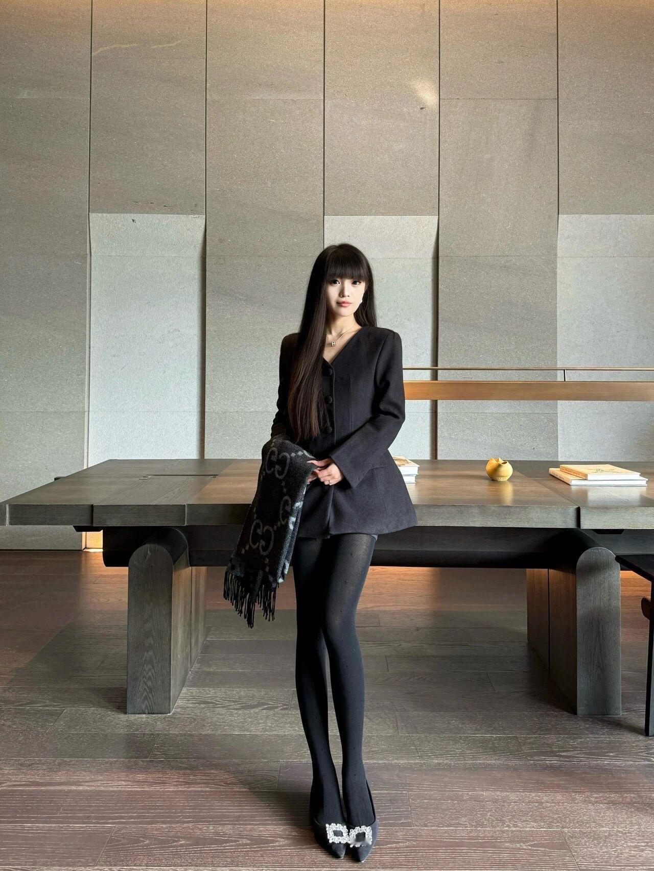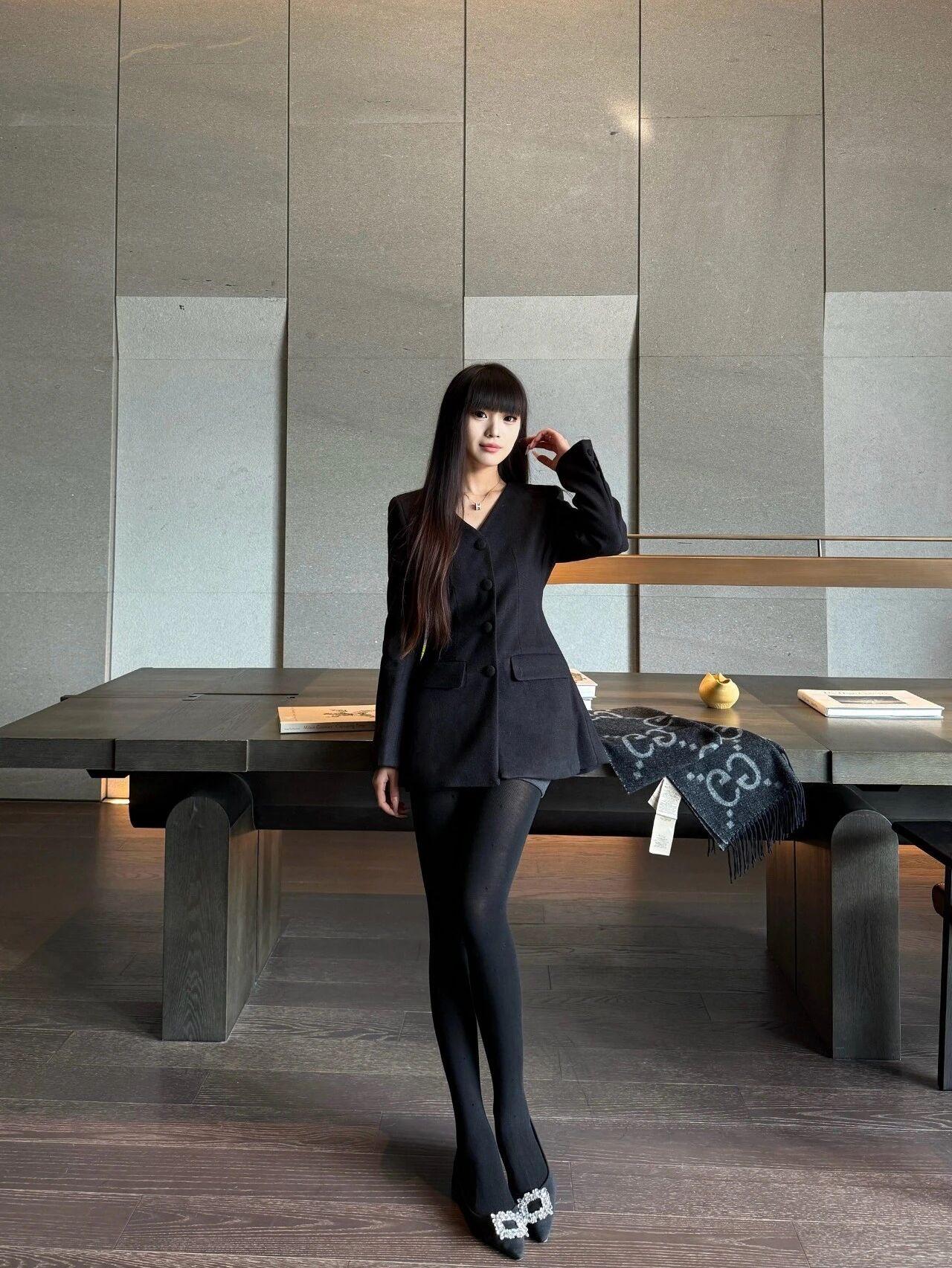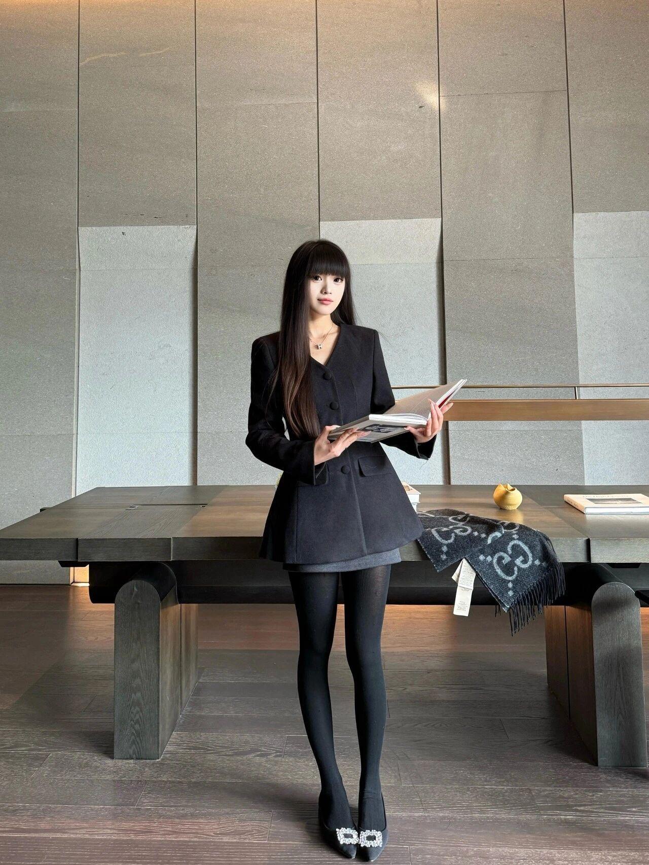 “​​黑色收腰西装+厚黑丝+平底鞋”,显瘦显高,一身黑好气质! 太喜欢这个掐腰设