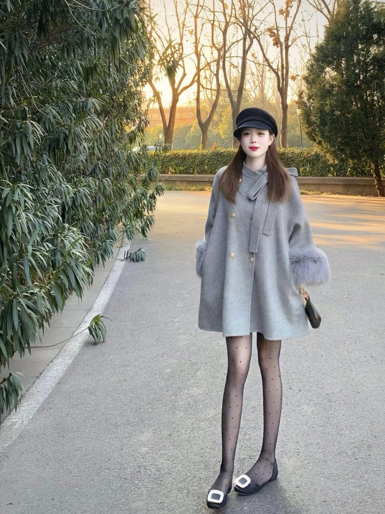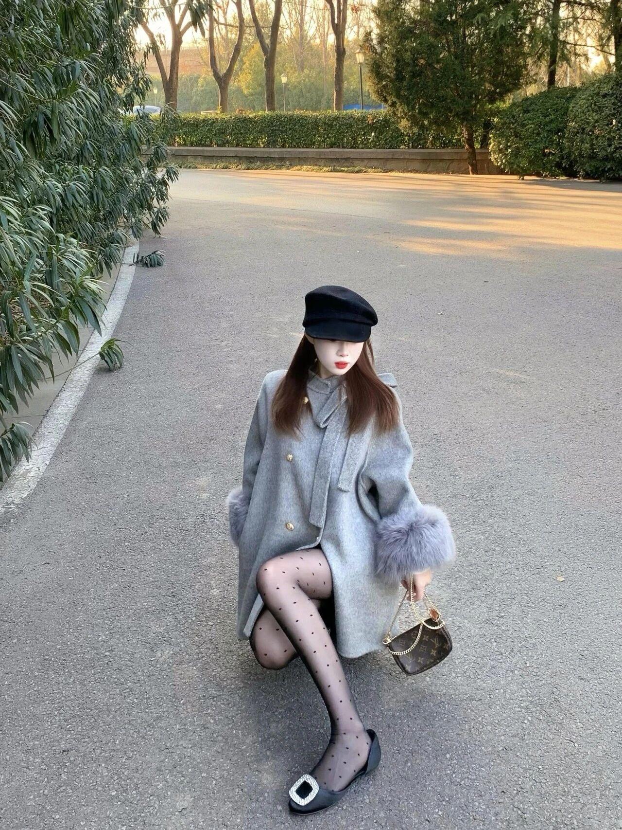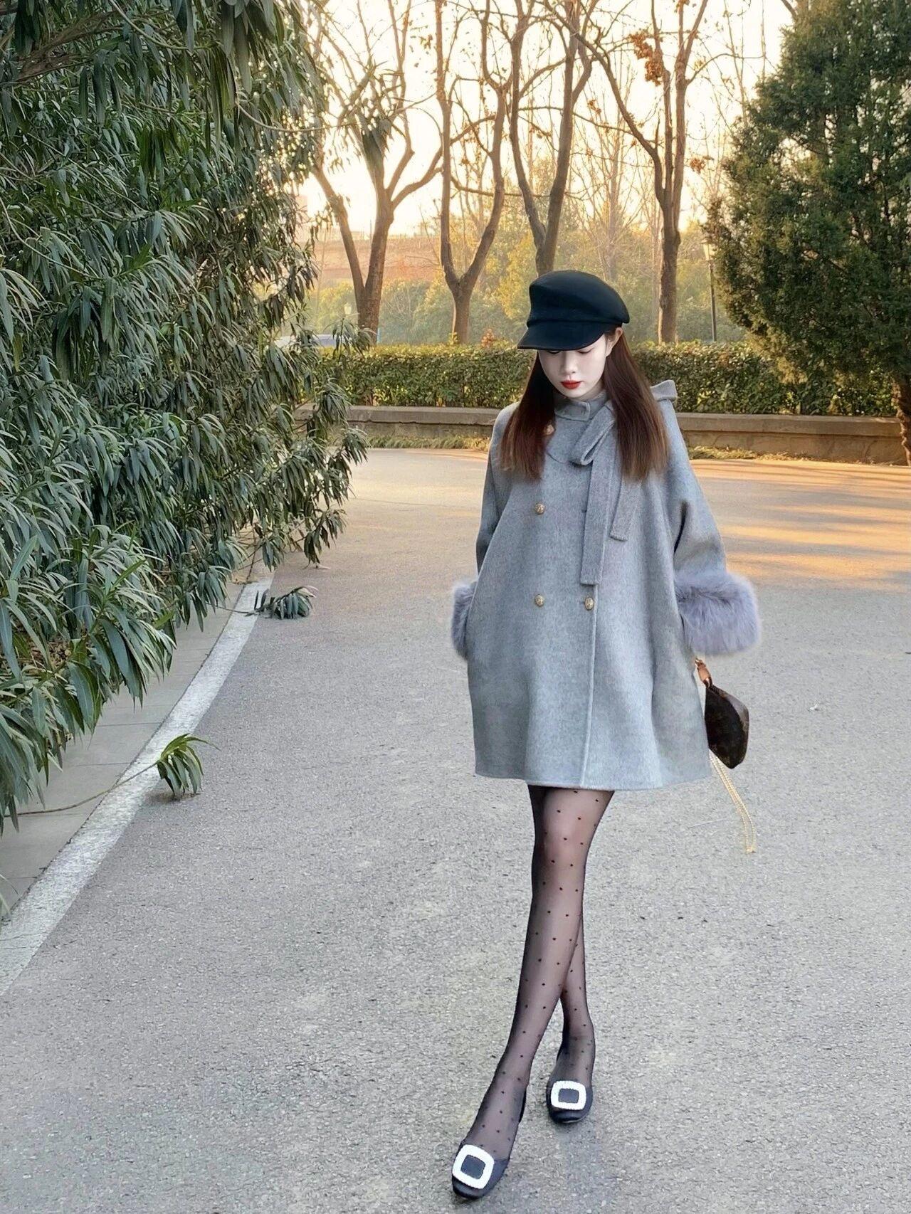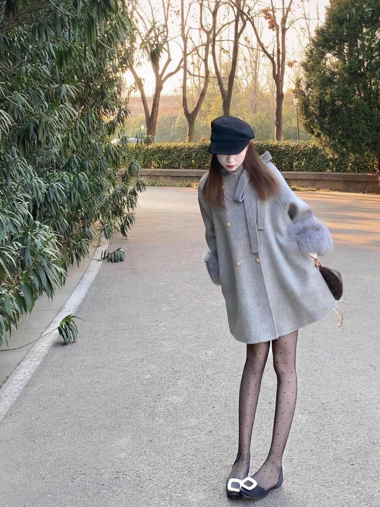 大衣和波点黑丝的搭配真的惊艳到了! 这套浅灰色中长外套搭配波点袜,再加上带方扣的平底鞋和帽子,整体风格温柔,日常穿很显气质~要是想走随性风,换双休闲鞋就行;喜欢亮眼点,选双颜色跳一点的袜子也不错,舒服好看,自己喜欢最重要~