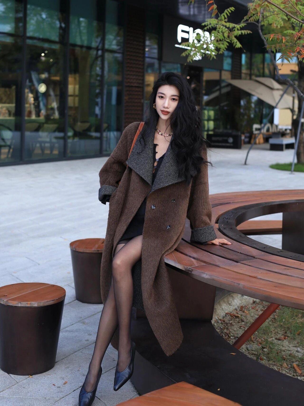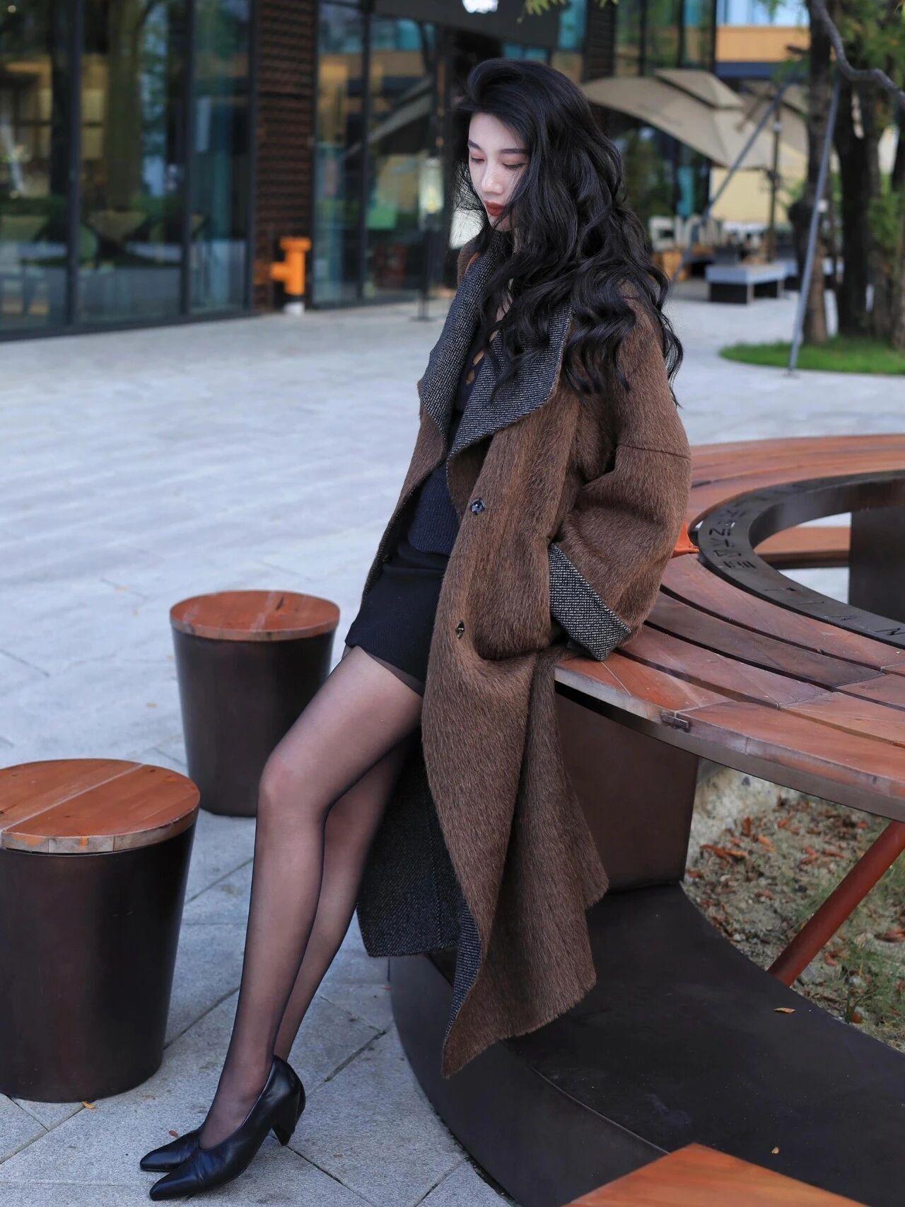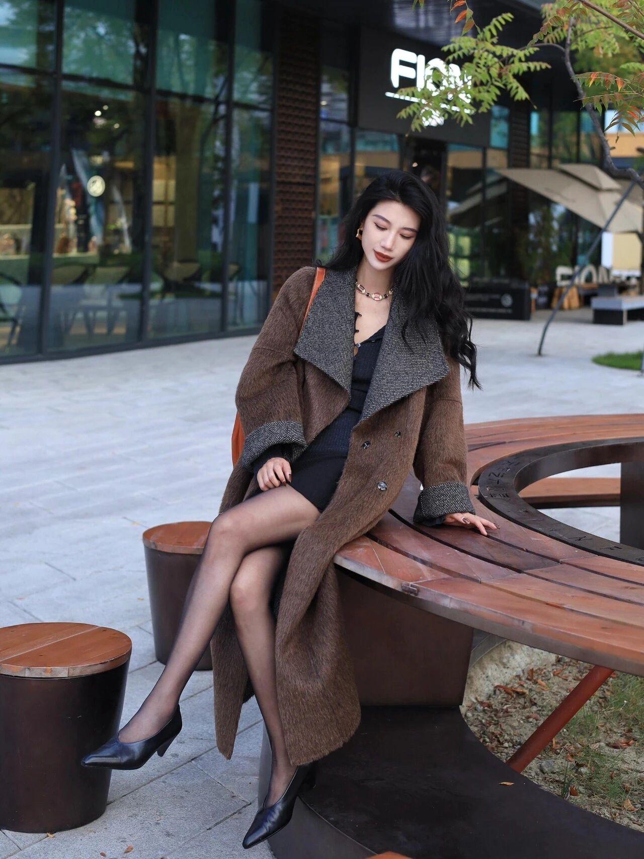 大地色系复古风大衣搭配黑色丝袜,温暖又舒适,自带秋冬氛围感 这套棕调大翻领撞色长