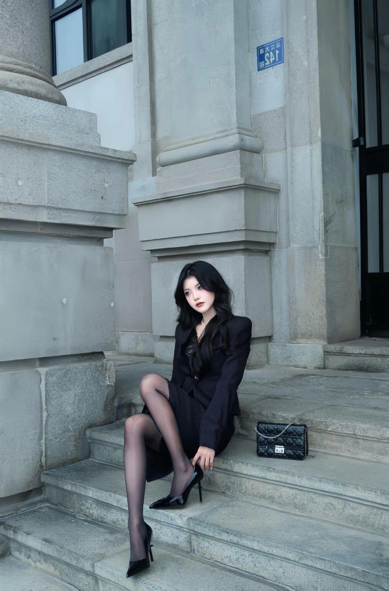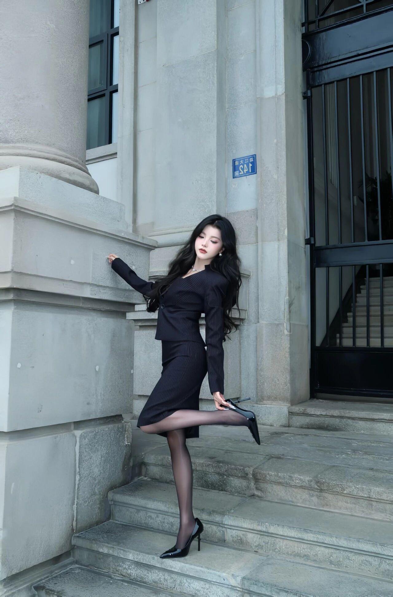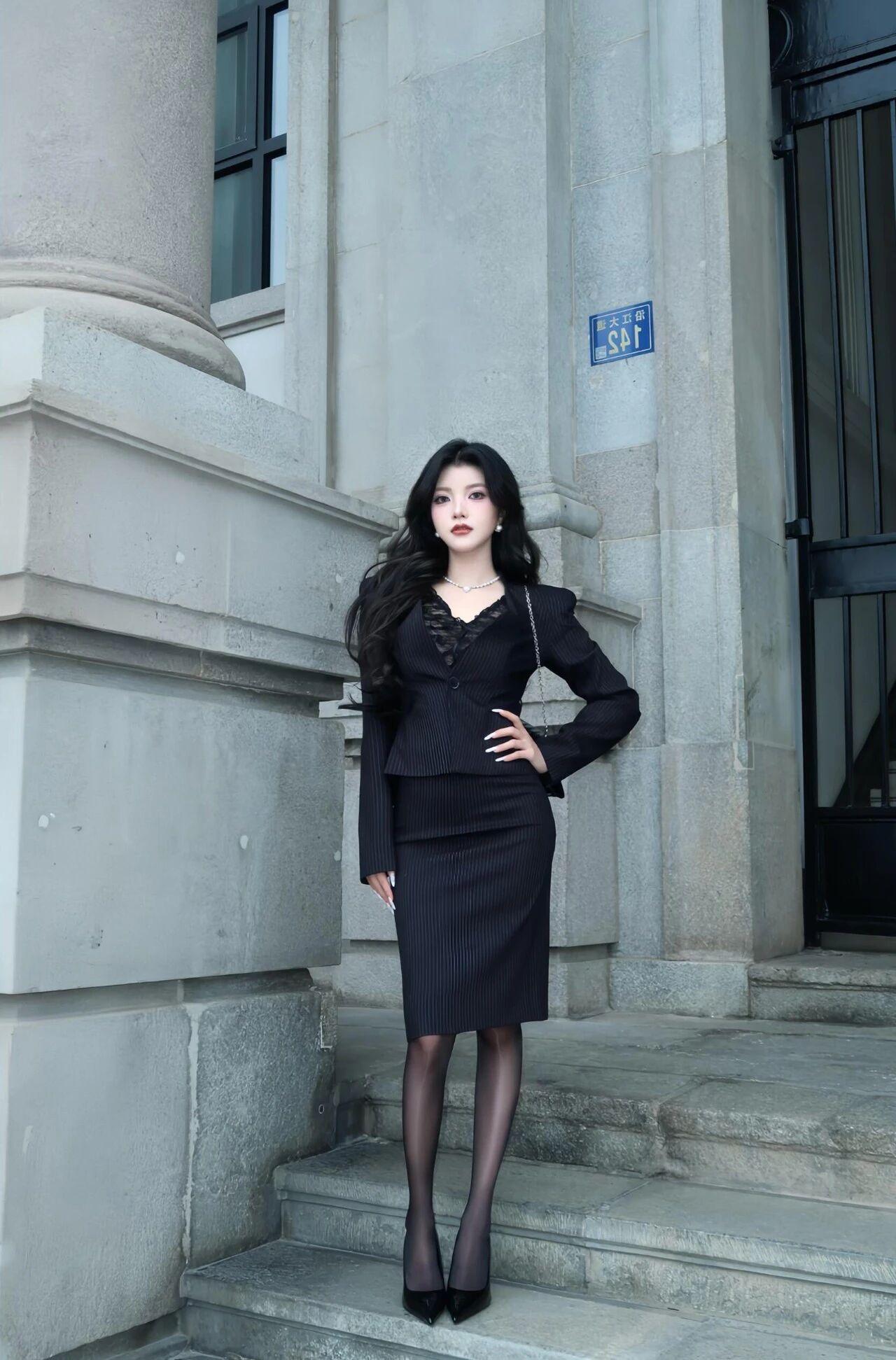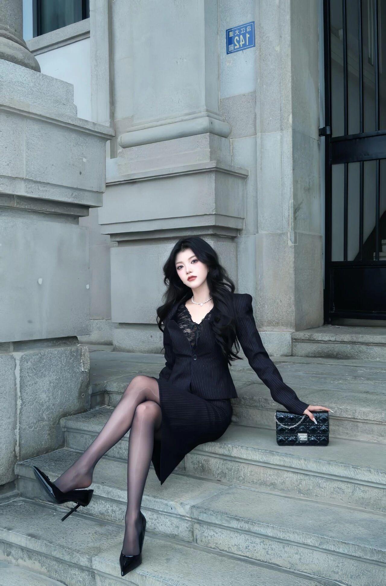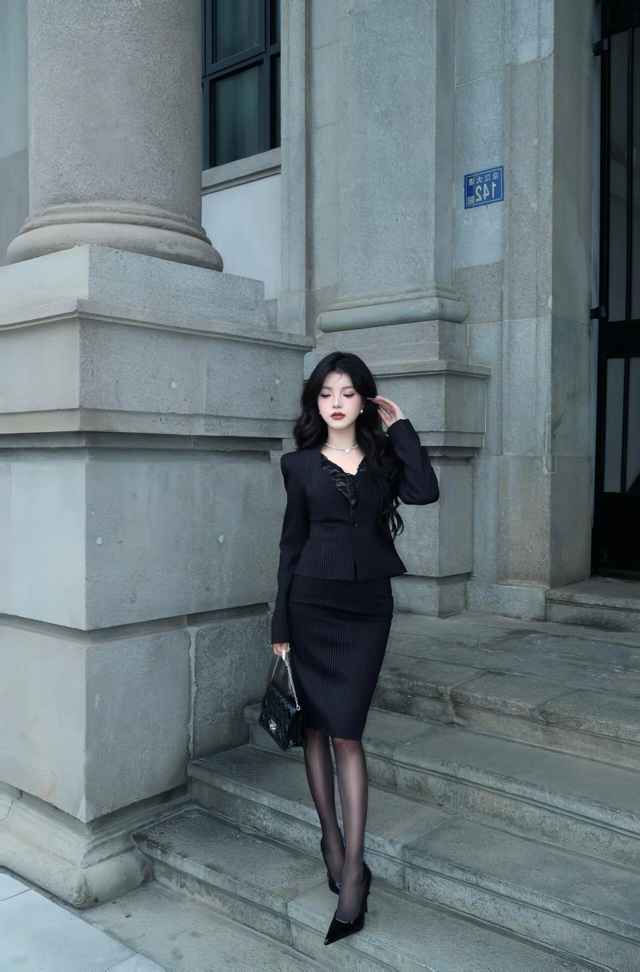“黑色西装套裙+光泽袜+小高跟”,精致干练,优雅自信 这套黑色套装的上衣是修身款