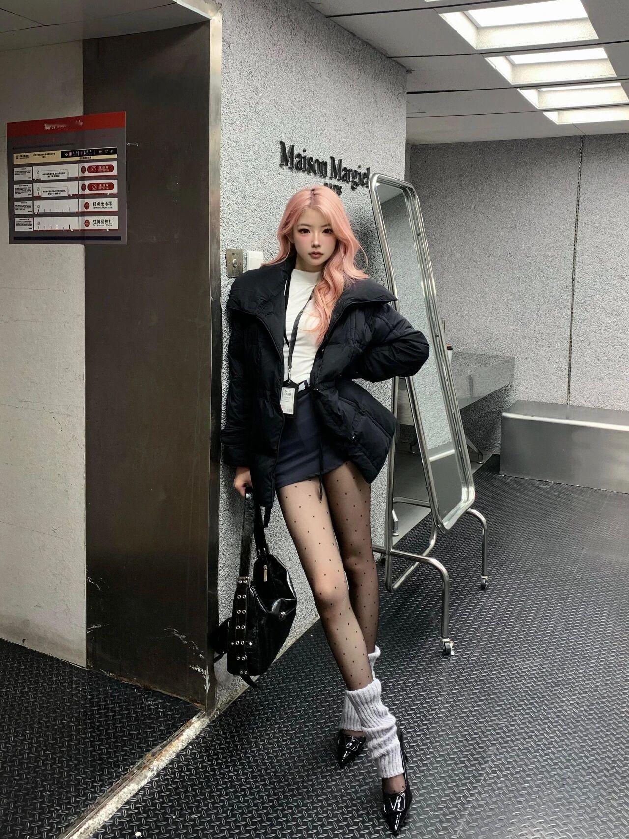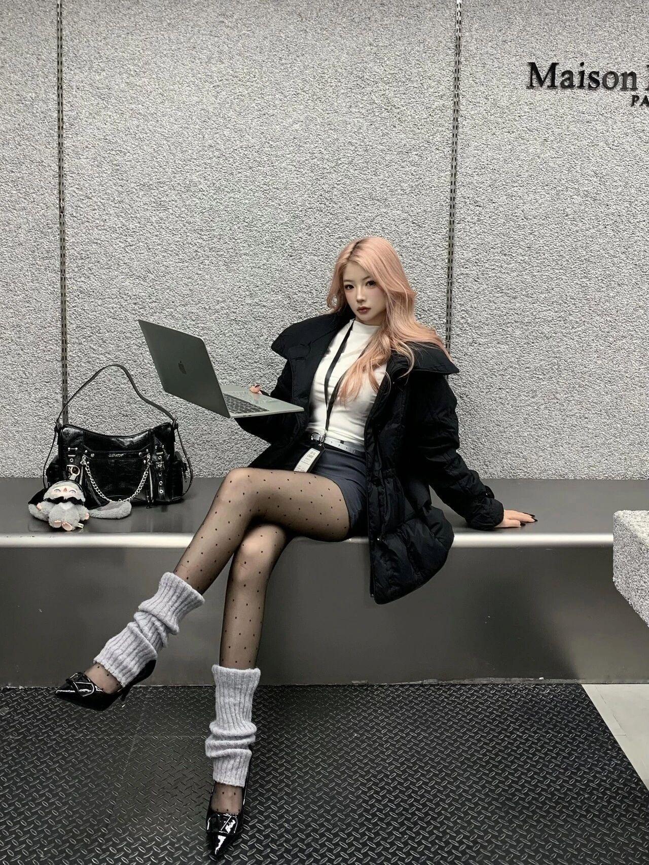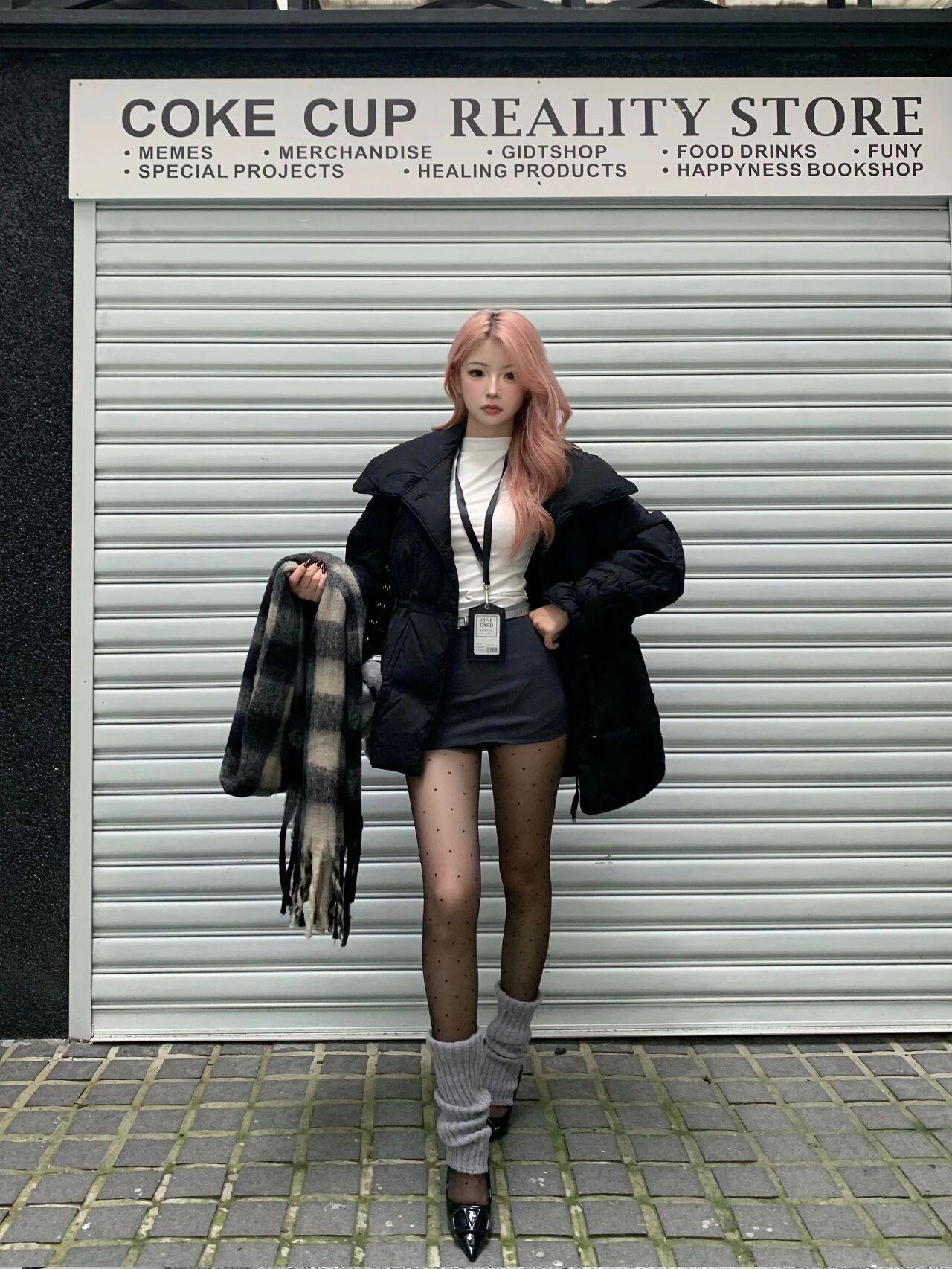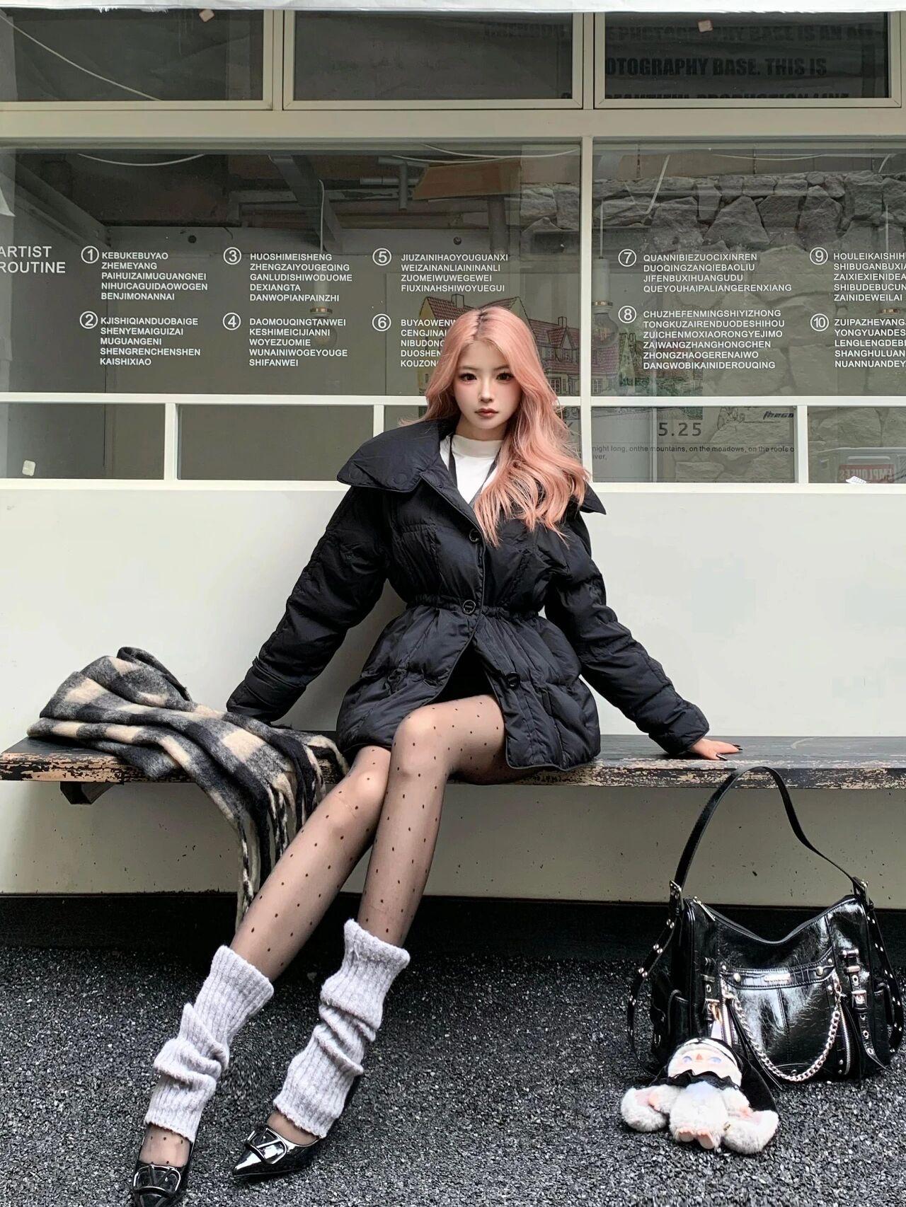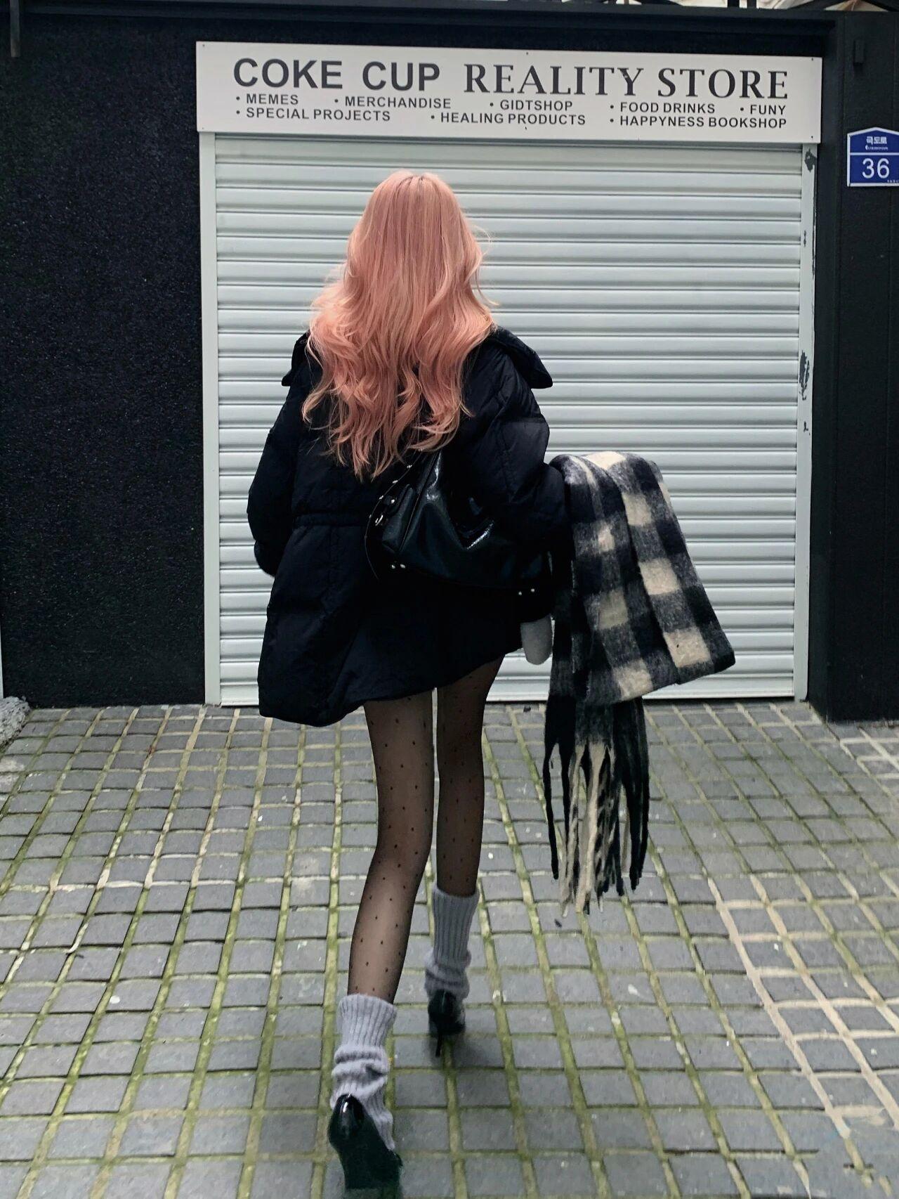 黑色羽绒服搭配波点丝袜,也能穿出时髦精的气质 这种穿搭把保暖和风格都照顾到啦,黑