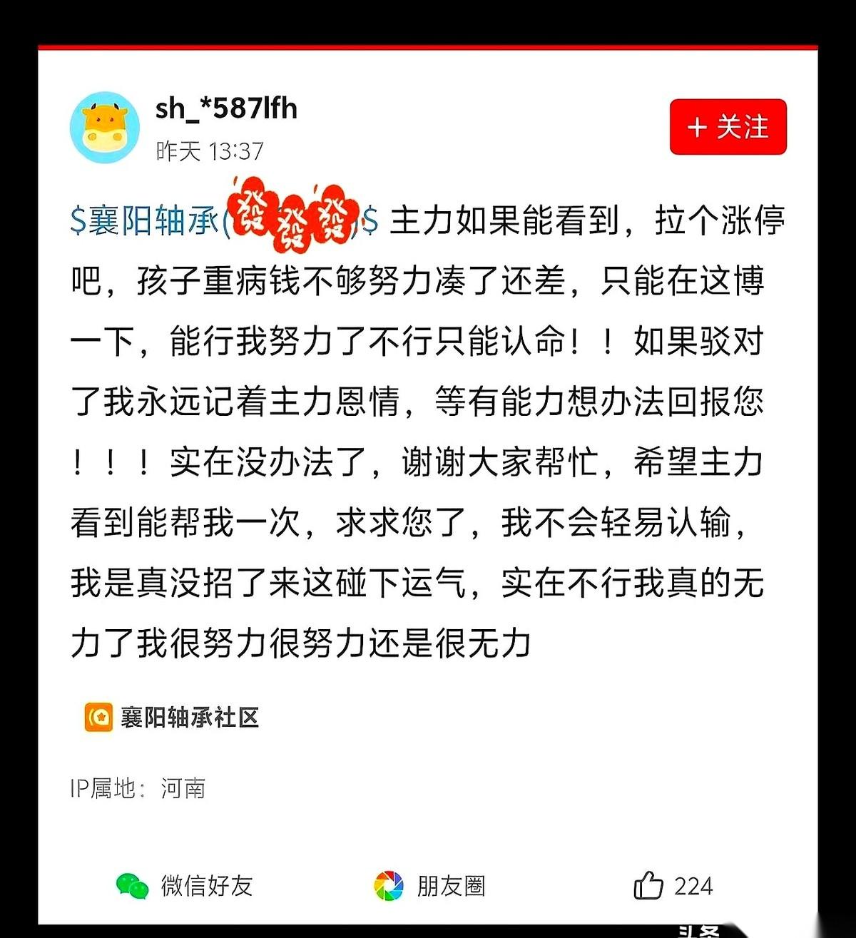 我跟你讲,今天这事儿,比任何电影都魔幻。 一个当爹的,实在没辙了,在股票论坛里,几乎是给襄阳轴承的“主力”们跪下了。 说孩子生病等钱救命,求求各位大佬拉个涨停,让他回点血。 那字里行间的绝望,隔着屏幕都能把人心给揪碎。 然后,最离谱的事情发生了。 帖子发出去没多久,股价真就跟听见了召唤一样,一条直线旱地拔葱,几笔巨量买单,Duang Duang Duang,死死地就给封在了涨停板上。 就那么稳。 我不知道那个爹当时是什么心情,我一个八竿子打不着的旁观者,看着那根红柱子,眼眶都他妈有点湿。 评论区更是炸了。 没有一个人在讨论股票,全是在给孩子祈福。 还有个大哥直接留言:“兄弟撑住,下周一我拿一万块进来帮你抬轿子,钱不多,一份心意。” 真的假的?是主力心善,还是纯属巧合? 这事儿已经不重要了。 重要的是,在一个冰冷的、用数字说话的资本市场里,我们居然看到了一个关于“许愿”和“显灵”的童话。 一个绝望的父亲,一群素不相识的股民,用一种最赛博朋克的方式,完成了一次爱的接力。 这大概就是中国人骨子里的温良吧。 平时可能嘻嘻哈哈,互称“韭菜”,但真到了人命关天的时候,所有人,都愿意用自己的方式,为你投上一票。 这一票,无关输赢,只为生命。