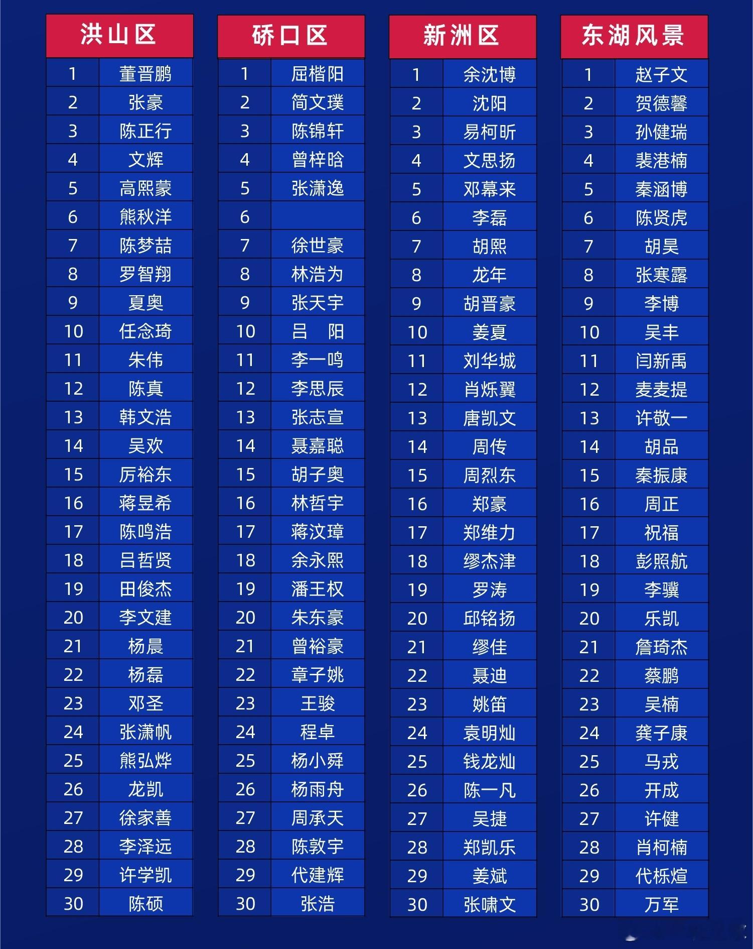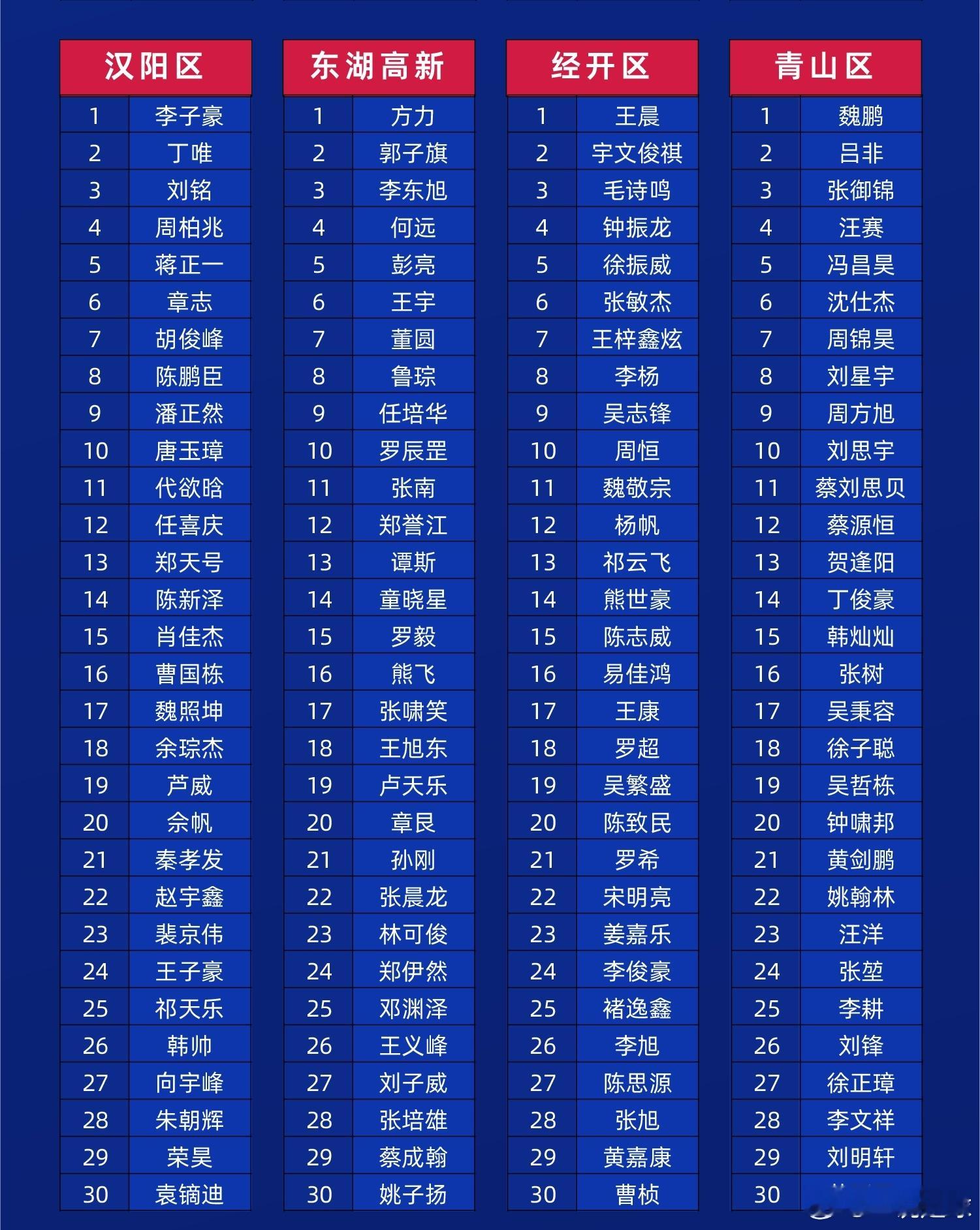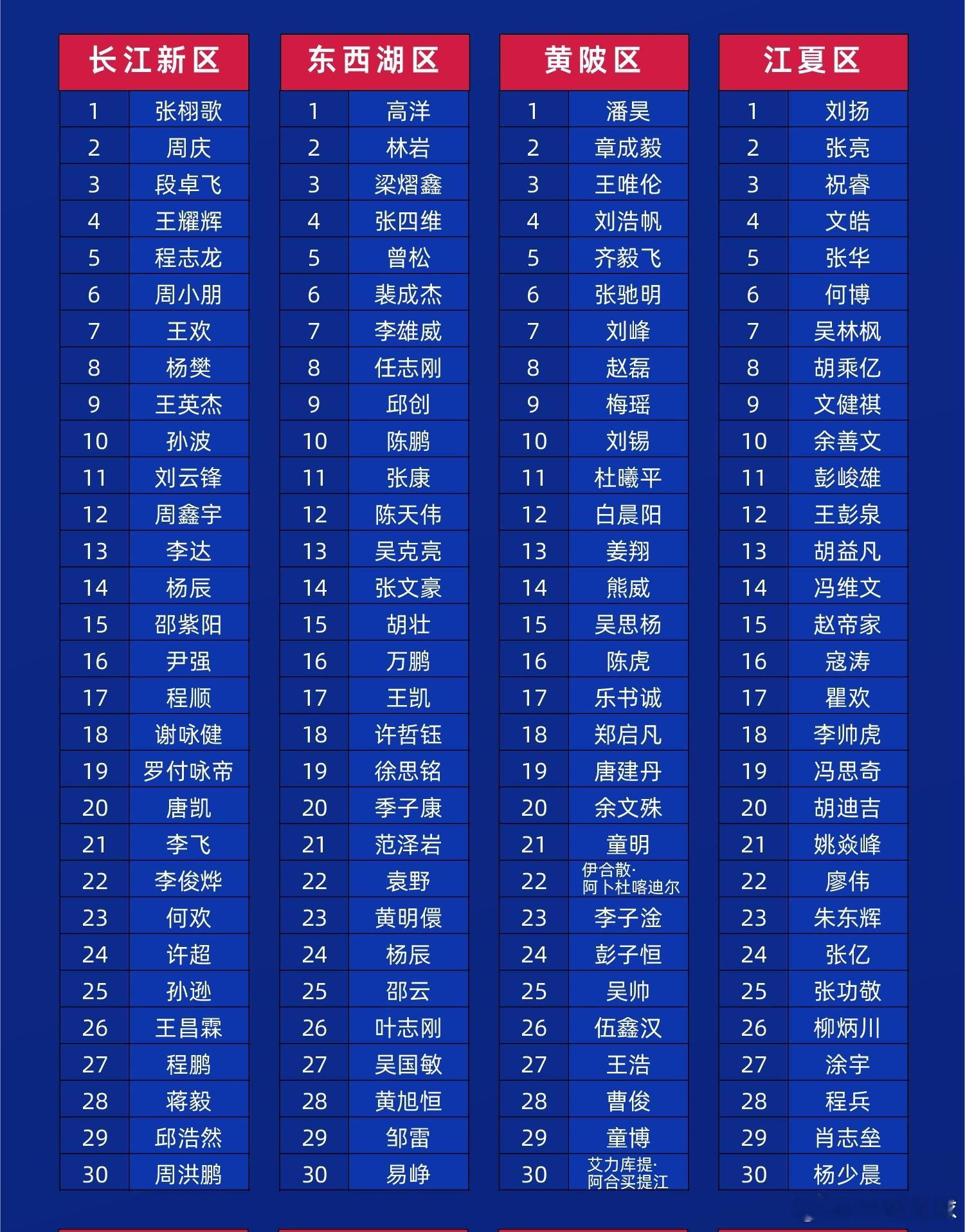 汉超16支城区球队大名单出炉!快来看看有没你认识的球星?!江汉区有汉军老门将闫毅压阵,荣昊报名汉阳区了,蔡甸是联镇的班底,刘浩帆是黄陂区的牌面,方力罗毅熊飞童晓星谭斯等名将力挺东湖高新,姚翰林坐镇青山……
