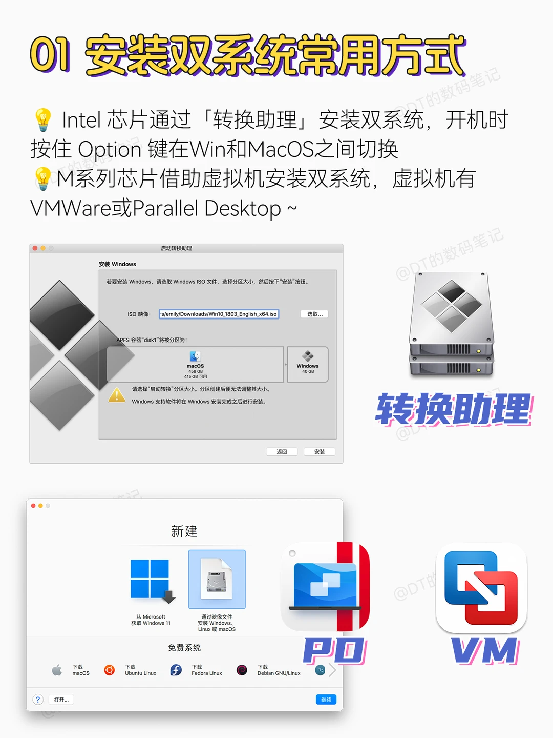 Intel 芯片通过「转换助理」安装,开机时按住 Option 键在Win和Mac之间切换