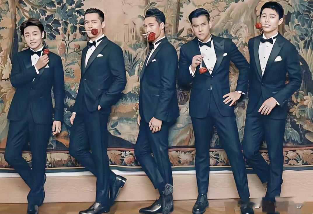 这张胡歌、袁弘和其他几位男星站在一起的照片,就像是一场轻松搞笑的小聚会。 五个帅哥站在一起,每个人都摆着不同的造型。花的拿法也五花八门,仨人用嘴叼着,一个把花放在肩前,一个把花朝下,一看就是故意玩花样。 他们的站姿很特别,他们的表情生动又带点小坏笑。整个画面光线亮亮的,背景干净,大家的笑容和姿势都透着一股顽皮劲儿,让人看了忍不住跟着开心起来。
