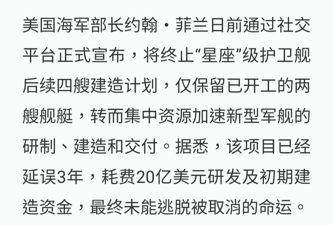 [特別報導] :美国海军的巅峰荣耀时代已成过去!从终止“星座”级护卫舰建造计划说起 :美国试图重振造船业, 但困难重重。根源在于战後的帝国霸权战略过度自信, 轻易捨弃钢铁和造船産业线, 改走服务业和高额利润的高端技术与金融資本业, 终至造成在突然崛起的新中国完整産业链对比之下, 大惊失色, 亟欲重建工业体系, 才发现不仅已力不从心, 而且为时已晚。僅造船业, 美国从1980年的120家猛减至18家, 其中只剩6家具备建造军事舰艇能力, 造船技术工人更是严重断层, 35岁以下工人只占12%, 而且未必有能力建造新型船艦, “星座”级护卫舰就是委外交付義大利造船厂建造的, 结果还是因为设计图纸一再更改, 工期ー再延长和成本一再升高, 而被迫中止建造计划。------------------------------------美国
