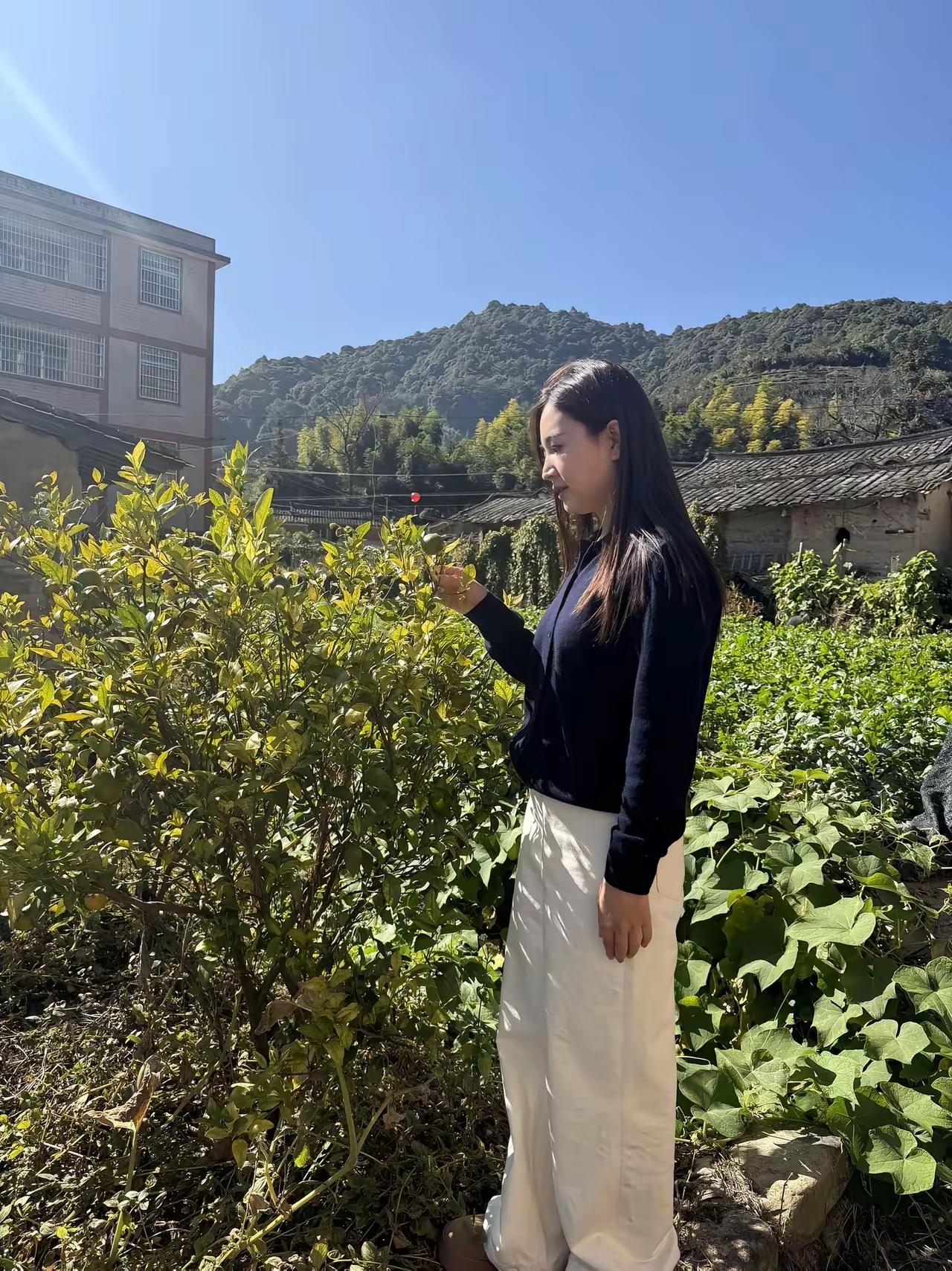 泥土的气息裹着晨露漫开,深褐的土地上,菜叶舒展着青绿的脉络。暗红针织衫的纹路与泥