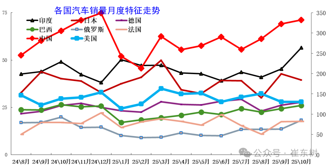 从主力国家代表的世界销量看,2018年后开始下滑周期,2020年进入谷底;2021年开始回升;2025年1-10月的世界销量增速6%的表现较好。今年中国车市的综合表现超预期上升,持续引领世界增长。