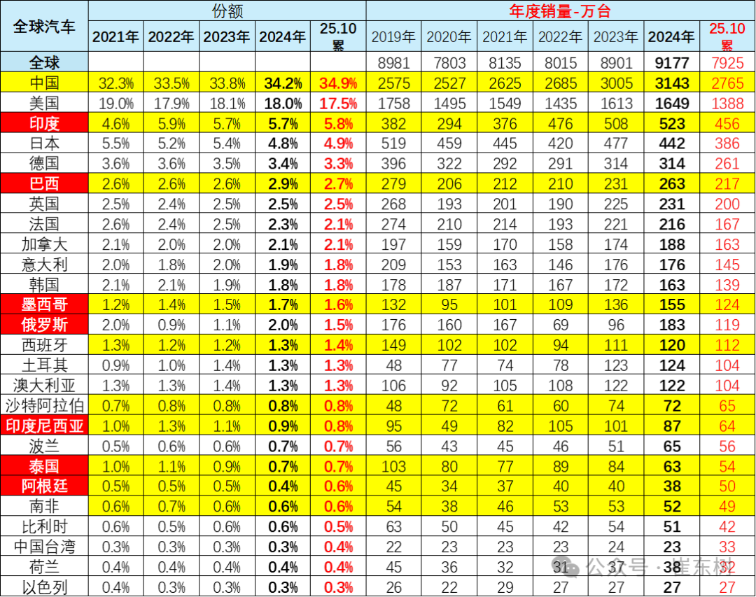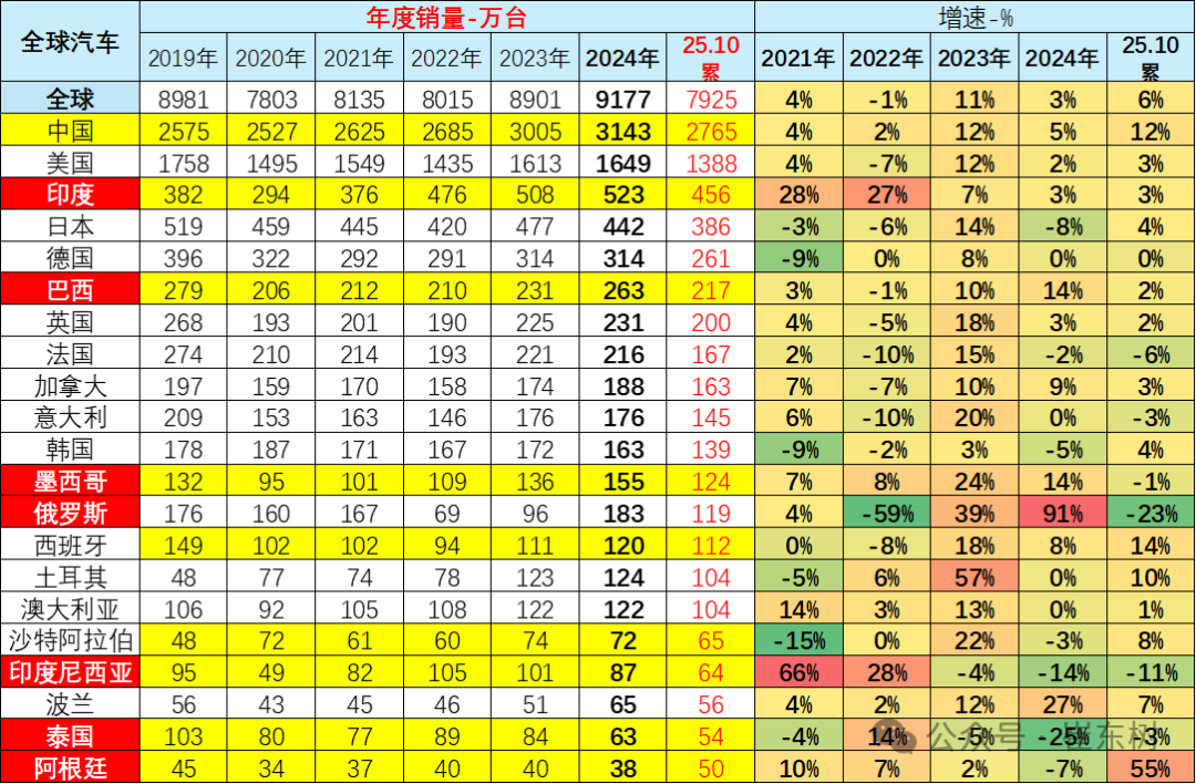 2025年1-10月的全球汽车销量增长6%,其中中国汽车销量2765万台增长12%,美国销量1388万台增3%,印度销量456万台增3%,日本销量386万台增4%,德国销量261万台、与上年持平。目前看中国市场最有活力,增速快。俄罗斯市场下滑严重,墨西哥的增速放缓,而南美的阿根廷等市场表现较好。