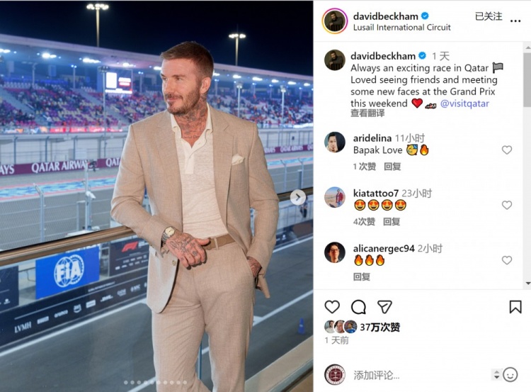 直播吧12月2日讯贝克汉姆更新社媒动态,晒出观战F1卡塔尔大奖赛的照片。