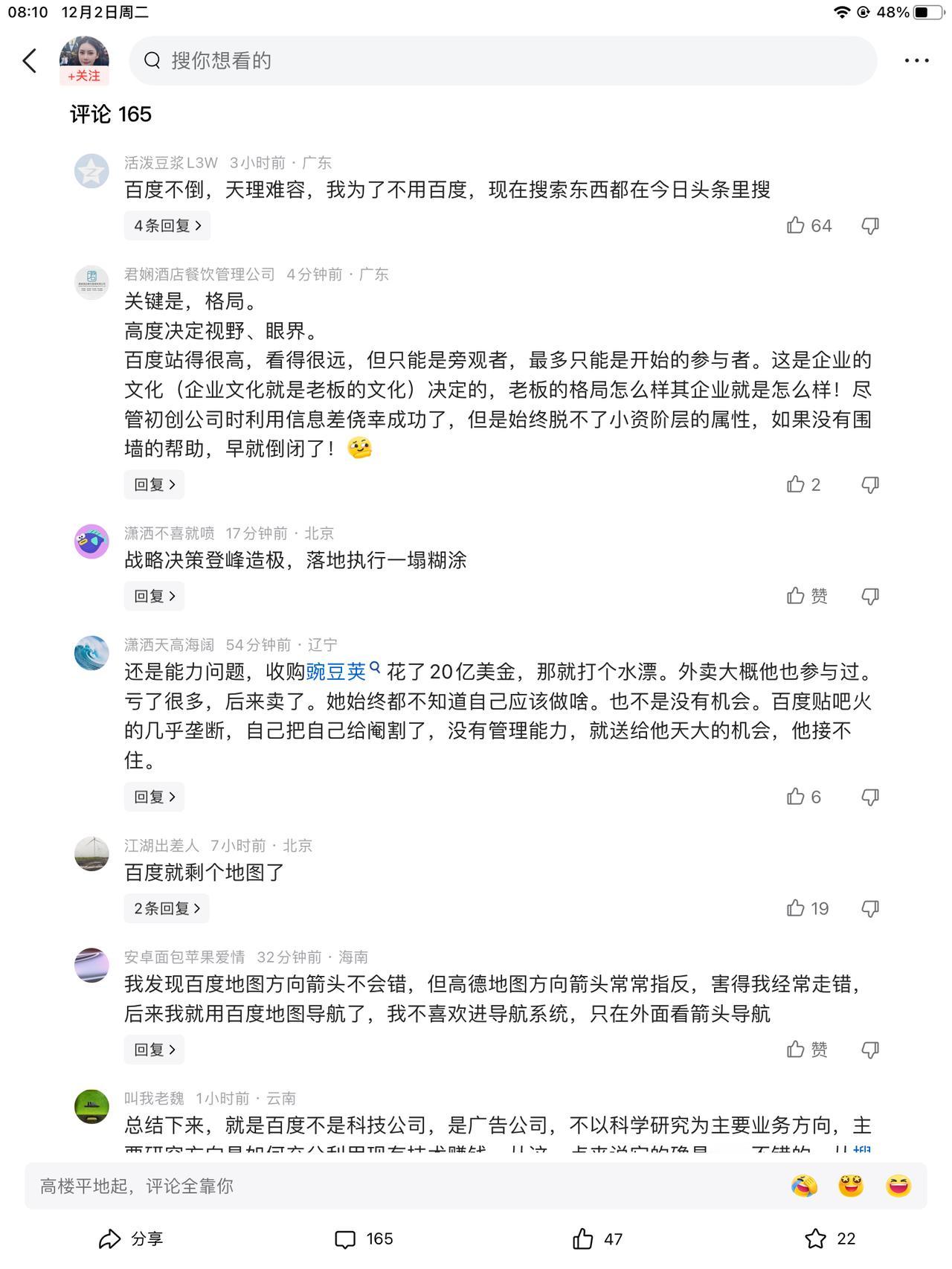 百度,第三季度亏损上百亿。他们是干嘛了,每天上班下班,都是为了去亏钱吗?除了度小满这个放贷产品,就完全没有进项了吗? 百度搜索,百度地图,文心一言。都没有挣钱的手段了吗? 别人我不知道,自从百度搜索,把很多人导到沟里了,导的云里雾里的,把魏某西导没了以后,我就有意无意的躲着百度走了。能不用就不用。 评论区说百度地图的箭头好用,下次试试,反正也不花钱。高德地图说实话,我很难分辨前后方向。每次就有好多冤枉路,才发现反了,又重新回头。百度