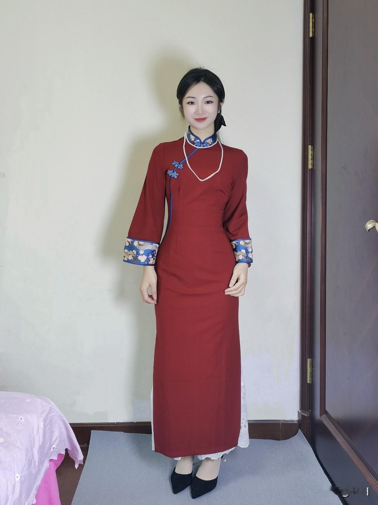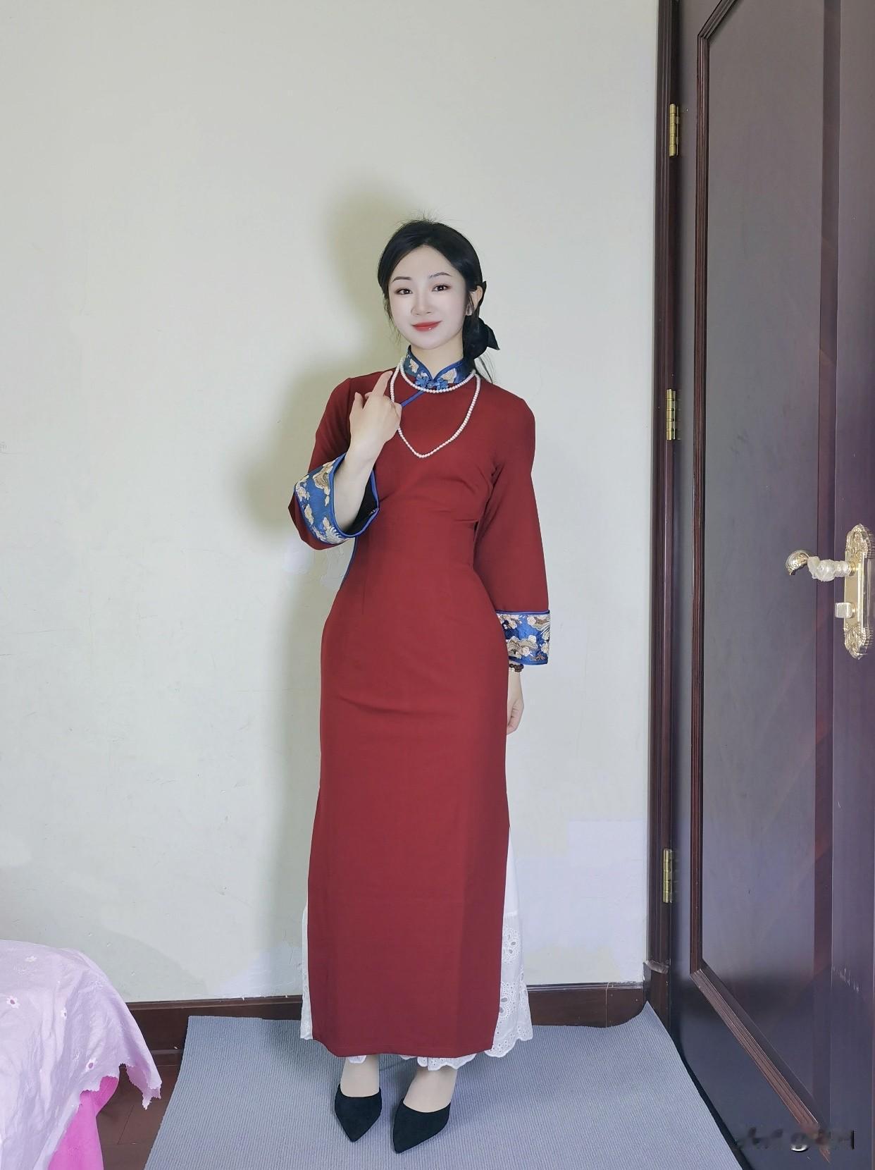 素雅的片色和印花布料缝制的旗袍。虽然在款式、穿着、搭配方面比较正统,但其风姿卓约