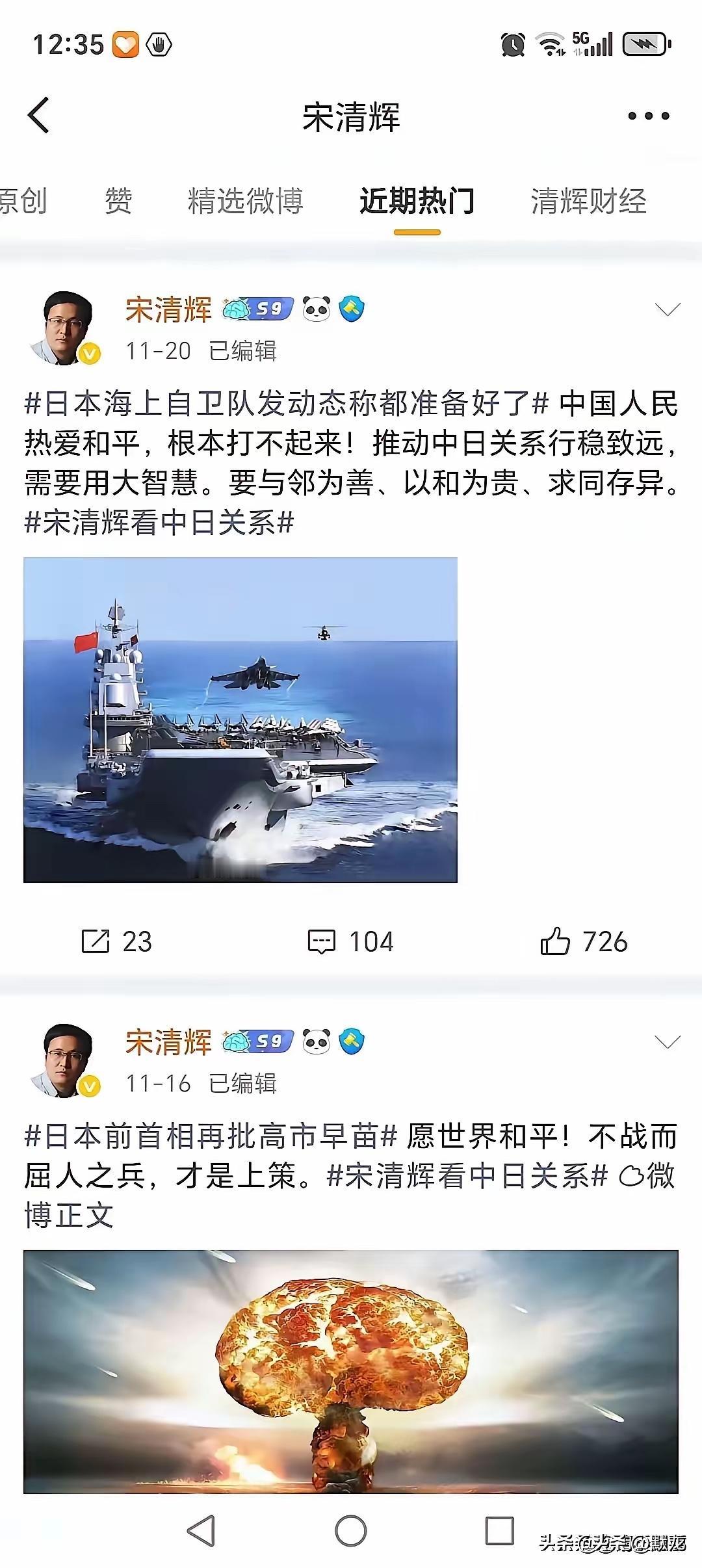 近日,学者、网络大V宋清辉因触犯法律法规,其账号被封禁,处于禁言状态。 宋清辉在网络上散布精日言论已久。其在社交媒体上,常以隐晦之词美化侵略历史、歪曲事实,将那段惨痛过往说得轻描淡写。这种行径挑战了民族底线与尊严,刺痛了每一个有良知的中国人的心。 建议全平台跟进,全面封禁此类“与日亲善”的两面人,别再出现像冯教授那样至今还在网上售卖赴日留学课程的情况。