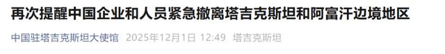中国驻塔吉克斯坦大使馆微信公众号11月28日发布《关于在塔中国公民遇袭的情况通报和安全提示》: