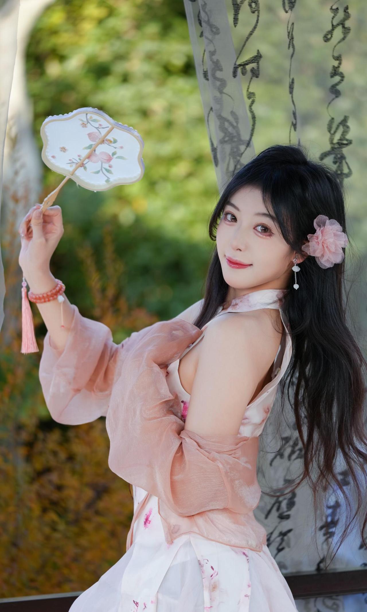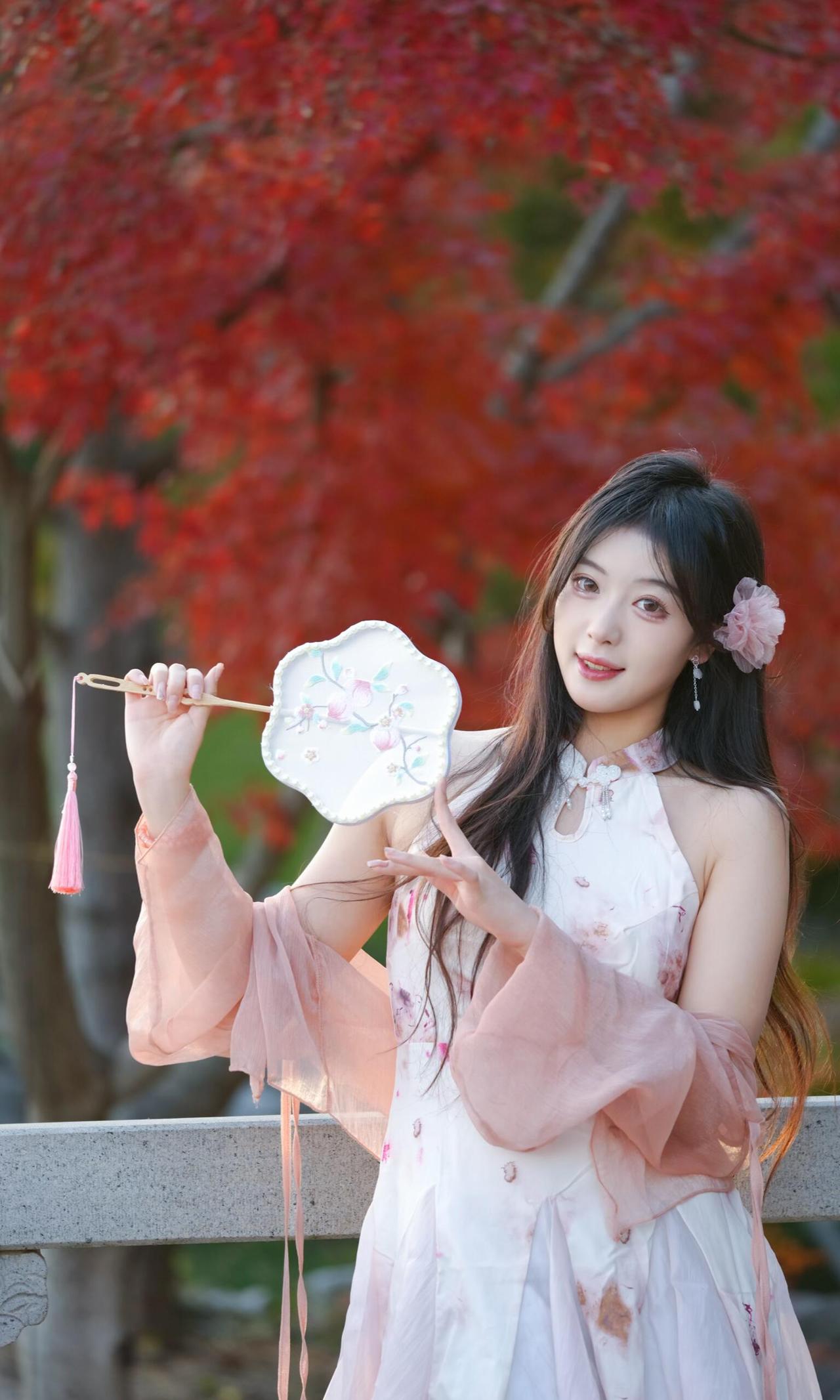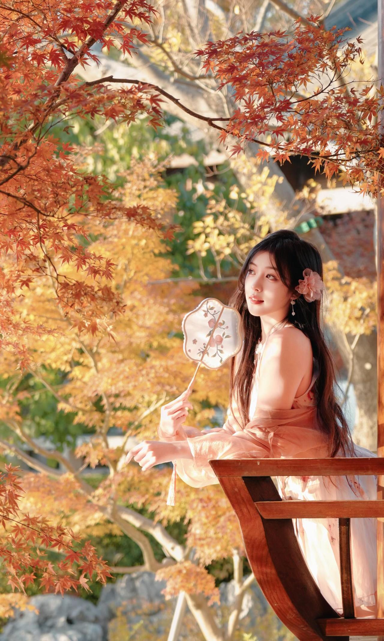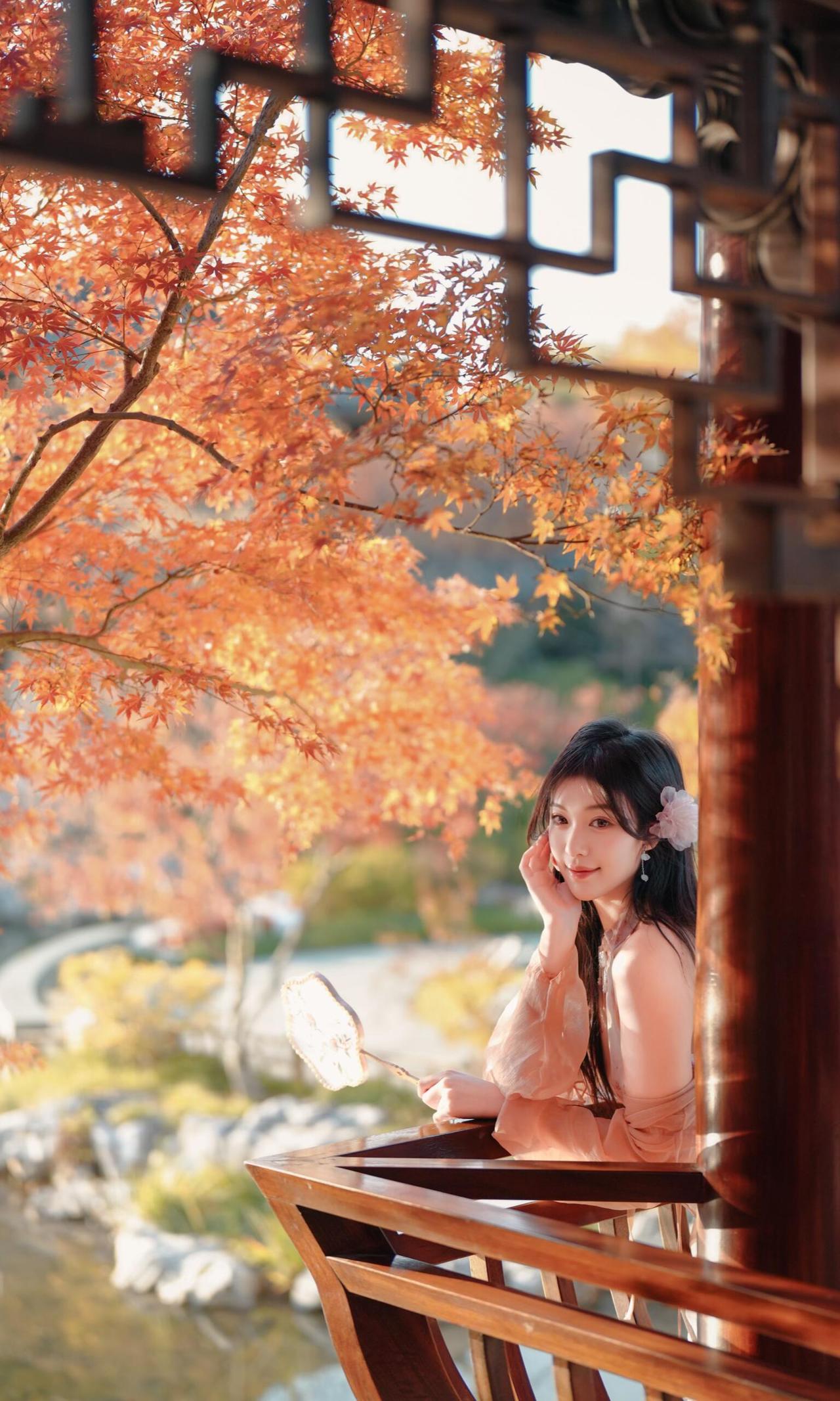 粉衫轻倚三秋树,霜叶红于二月花。 亭台映霞,枫枝凝霜,粉衫佳人轻倚疏林,团扇半掩眉间俏。风过红叶簌簌落肩头,暖阳穿林洒下斑驳光影,每片霜叶都染着浓烈秋意,清艳胜春。 指尖抚过微凉枝丫,沾惹的不仅是枫香,更是时光沉淀的温柔。这秋,是粉衫与红叶的邂逅,是自然馈赠的限定浪漫,沉醉在“霜叶红胜花”的诗意里。 = = = = = = = = = = = = = = = = = = = = = = 摄影思路分享: ①选15:00-16:00侧逆光,用大光圈虚化背景突出人物与红枫; ②让模特侧身倚树,团扇与粉衫形成冷暖对比; ③低角度拍摄纳入亭台飞檐,用红叶作前景增加层次感,后期微调饱和度保留秋景通透感。