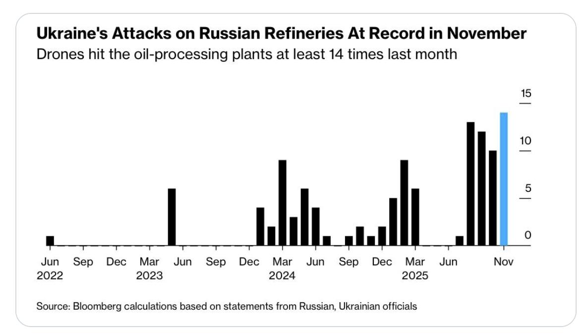【乌克兰猛烈攻击俄罗斯炼油厂——11月创下袭击次数历史新高】据彭博社报道,此前8月份的袭击次数纪录为12次。如今,乌克兰军队又创下新高:至少对俄罗斯石油基础设施发动了14次袭击。 和往常一样,一些关键设施遭到破坏。其中包括位于克拉斯诺达尔附近的阿菲普斯基炼油厂——俄罗斯南部最大的炼油厂之一。俄罗斯石油公司位于梁赞的炼油厂自本月中旬以来一直处于停产状态:其主要加工装置已停止运转。 除了炼油厂,乌克兰还对黑海沿岸的石油装卸设施发动了四次袭击。例如,在诺沃罗西斯克,石油出口中断了数日。 到月底,乌克兰海军无人机在黑海袭击了两艘受制裁的油轮。