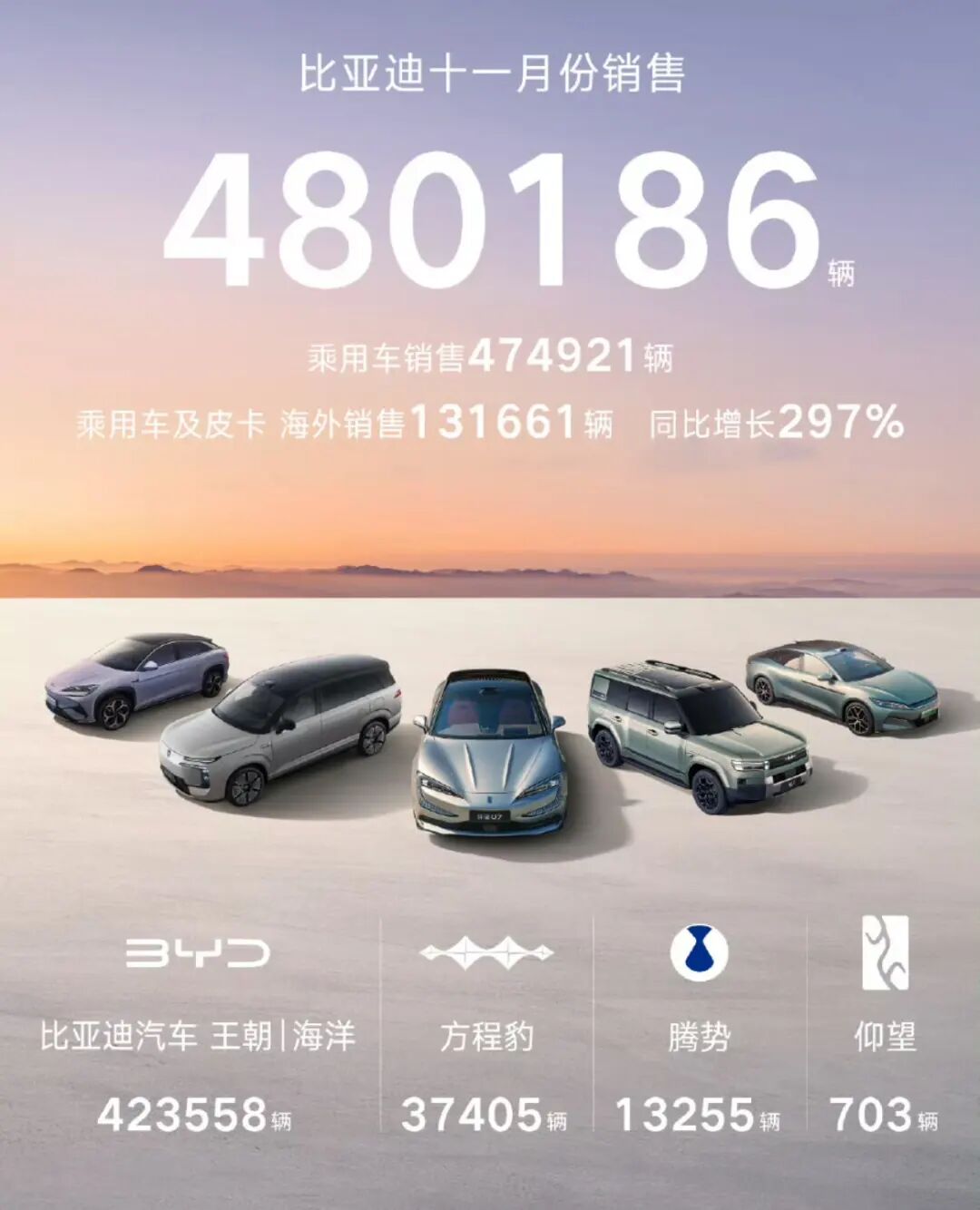 作为国内新能源汽车产销规模最大的上市公司,12月1日晚,比亚迪披露,比亚迪11月汽车销量480186辆,2024年同期为506804辆。2025年1-11月,比亚迪汽车销量418万辆,同比增长11.3%。另外,比亚迪2025年11月新能源汽车动力电池及储能电池装机总量约为27.669GWh,2025年累计装机总量约为258.282GWh。