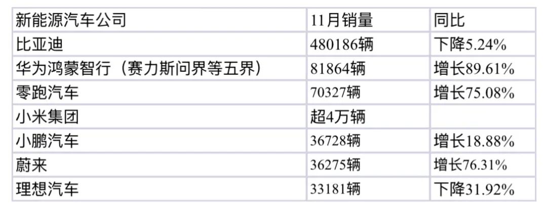 12月1日,专注新能源汽车的上市公司和品牌纷纷发布11月的“最新成绩单”。销量数据显示,在年终冲刺的背景下,蔚小理(蔚来、小鹏汽车、理想汽车)三家销量均在3.5万辆左右,零跑汽车月销突破7万辆,在造车新势力中领先。比亚迪销量相比2024年同期有所回落。凭借五界(问界、智界、享界、尊界、尚界)的合力表现,华为鸿蒙智行全系车型11月交付新车突破8万辆,同比增长近90%。近期相对沉寂的小米汽车11月交付量依然超过4万辆。