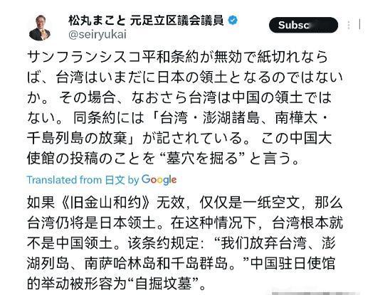 日本前议员松丸诚撂话,中国若不接受旧金山和约,那台湾就是日本“领土”!12月1日,松丸诚刊文声称,若《旧金山和约》无效、不过是一张废纸,那台湾不就依然是日本的“领土”了吗?倘若如此,台湾就“更不可能”是中国的领土了。该条约中明确记载着“放弃台湾、澎湖列岛、南库页岛及千岛群岛”。中国大使馆的相关发文,简直是“自掘坟墓”。 二战结束时,中、美、英三国《开罗宣言》白纸黑字写着“日本窃取的台湾、澎湖必须归还中国”,1945年日本签《投降书》时也认了账。 可松丸诚故意跳过1945年台湾已回归的事实,把1951年美国牵头搞的《旧金山和约》当成“台湾地位说明书”,本质是偷换概念,《开罗宣言》是定罪判决书,《旧金山和约》是强盗团伙事后补的“分赃清单”,受害者没签字,这清单当然无效。 更关键的是,日本自己早就认了账。1972年中日建交时,日本在《联合声明》里明确“承认中华人民共和国是中国唯一合法政府”,“坚持遵循《波茨坦公告》第八条”(即落实《开罗宣言》)。这相当于日本自己签了新合同,把《旧金山和约》的破纸条给盖过去了。现在松丸诚翻旧账,就像有人签了新合同后又拿出废纸说“按老规矩来”,纯属耍赖。 美国当年搞《旧金山和约》,根本目的是冷战布局,1949年国民党败退台湾,美国一看扶持的代理人没了,就想把日本拉入伙当桥头堡。于是故意在和约里用“放弃台湾”代替“归还中国”,留了个模糊空间。 松丸诚现在捡起这个漏洞,不是真不懂国际法,而是想借“条约无效论”给“台独”撑腰,甚至暗示日本对台湾还有“历史权利”,这和当年军国主义“台湾是日本生命线”的论调一脉相承。 最讽刺的是,《旧金山和约》本身就是违法的。1942年中、美、英、苏等26国签《联合国家宣言》,明确规定“不得与敌国单独媾和”。美国却在1951年撇开中国、苏联,拉着48国搞了个“小圈子和约”。 中国政府从1951年就声明“不承认、无效”,后来联合国2758号决议也确认中华人民共和国是唯一合法代表,松丸诚拿一张被国际社会抛弃的废纸说事,纯属自欺欺人。 松丸诚的逻辑还有个致命伤,如果按“未签字就无效”,那日本更没资格谈台湾。《开罗宣言》《波茨坦公告》是中、美、英三国定的,日本作为战败国只有接受的份,连签字权都没有。 好比罪犯在法庭上听到判决,后来却声称“我没在判决书上签字,所以判决无效”,这种无赖逻辑在国际法上站不住脚。台湾从1945年起就是中国领土,这是二战胜利成果,不是哪个条约能随意改写的。 现在日本右翼老拿《旧金山和约》说事,本质是想否定二战结果,推翻战后国际秩序。他们心里清楚,只要咬死“台湾地位未定”,就能给“台独”递刀子,甚至为未来插手台海找借口。 但历史铁证如山,1945年台湾光复时,全岛挂青天白日旗迎接中国军队;1972年中日建交时,田中角荣明确表示“充分理解台湾是中国一部分”。松丸诚之流的言论,不过是军国主义幽灵的余孽,想用一张废纸篡改历史,注定徒劳。