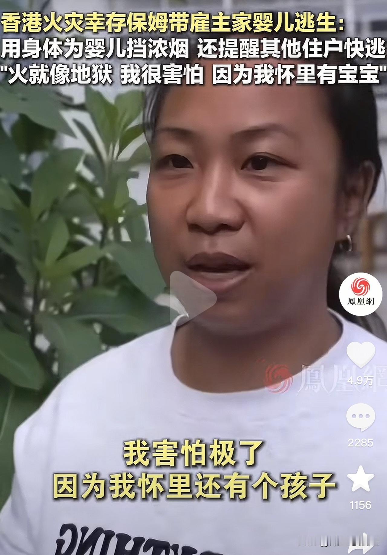 香港火灾中菲佣从22楼抱娃成功逃生,事后流泪回忆,当时害怕极了。 起火时,她正在雇主家照看孩子,发现起火那一刻,她第一反应不是自己逃,而是冲进房间一把抱起孩子。 跑出去后她还大喊提醒其他住户逃生,楼道里已经浓烟滚滚,看不清路,她把孩子的头按在自己怀里,用身体挡着烟,摸着墙壁就开始往下冲。 浓烟呛得她不停咳嗽,眼睛被熏得直流泪。 跑到11楼时,她已经吓得腿软得发抖,呼吸越来越困难,感觉随时会晕倒,但看到怀里的孩子,她又咬紧了牙关。 事后她红着眼睛说,我害怕极了,因为我怀里还有个孩子,一想到孩子,我就告诉自己不能倒下。 最终她和孩子都成功逃生,下楼后没多久,整栋楼就被大火包围,她整个人瘫坐在地上,才发现自己浑身都在颤抖。 菲佣姐姐的举动让无数人泪目,此时她在雇主心中,早已不是工人,而是全家的救命恩人! 有网友表示:只有从22楼下到一楼过的人才知道,多害怕,还要抱着一个孩子,腿都会软。 还有网友表示:她没有一个人逃出来,而是抱着孩子逃生,再那种情况下抱着孩子逃生,对于体力和信念都是一种考验 原来最朴素的善良,从来不分国籍和身份,火灾无情人间有爱,这场大火让我们看到了普通人愿意为他人拼命的担当。 为这位菲佣点赞,愿所有善良都被温柔以待。