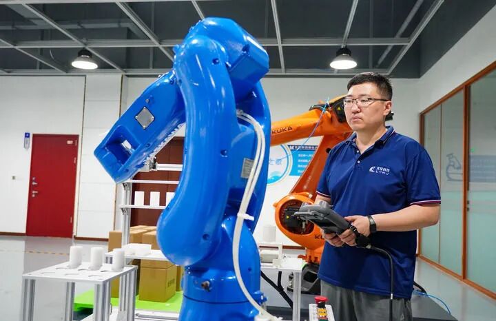 在位于龙口市的龙牙智能生产车间里,工作人员在检测一台工业机器人(7月2日摄)。
