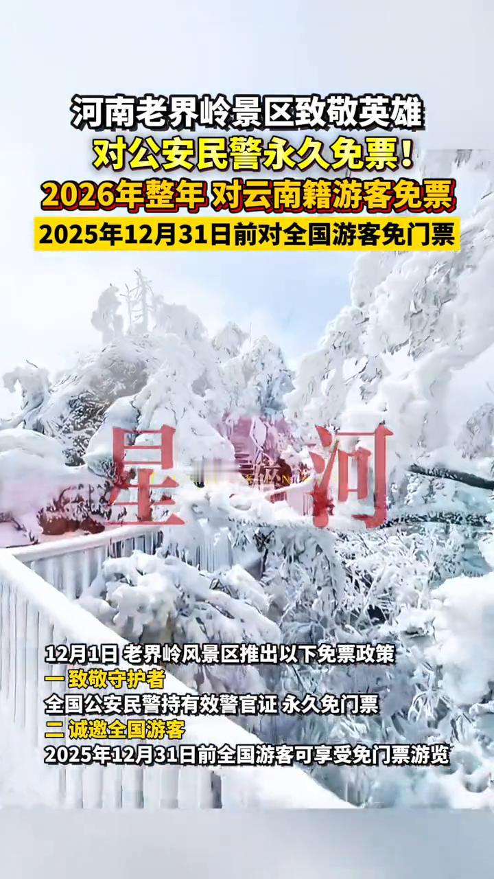 河南老界岭景区致敬英雄,对公安民警永久免票! 2026年整年对云南籍游客免票,2025年12月31日前对全国游客免门票。12月1日老界岭风景区推出以下免票政策: ·一、致敬守护者,全国公安民警持有效警官证永久免门票。 ·二、诚邀全国游客,2025年12月31日前全国游客可享受免门票游览。 ·三、情系云南,2026年全年特面向云南省居民推出免门票活动。 老界岭景区位于河南省南阳市西峡县境内,是国家5A级旅游景区,国家级自然保护区,是中国南北气候的分界线,长江流域和黄河流域的分水岭。 老界岭景区是中国最难熬的一天,是中国最难熬的一天。
