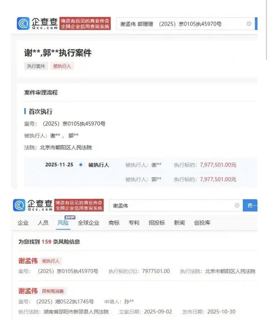 12月1日消息,企查查显示谢孟伟夫妇新增约797.75万元的被执行人信息,此前他就因被执行超1400万引发关注,今年9月他穿警服直播带货,被人举报。10月还被限制高消费。与此同时,他还有两部微短剧已播出,14部影视剧未播,甚至正在拍电影《缉毒风暴》时闹出穿警服风波。这接二连三的状况,真不知道他未来该咋整。 A网友:能被执行797万,就说明他有797万的收入,他们哪来的巨额财富?他也没拍多少戏啊,怎么这么有钱? B网友:直播带货,卖假酒挣得钱全赔进去了。一个刑余之人,屡次被执行。这还是我小时候看到的嘎子吗?老天为他开扇门,他却为自己在看守所里开了扇门。 人的欲望是没有底线的,赚的钱早就够一辈子衣食无忧了,找个小地方,做做公益,增增名声,谦虚卑躬一些,多生几个孩子,多做榜样,自己考考公,给孩子铺铺路,多好的开局啊!一手好牌打得稀烂,如今名声狼藉,怕是财运都会离去了。要知道,名与利,是挂钩的。不对等,都会失去。