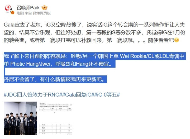 直播吧12月2日讯微博爆料人“召唤师Park”爆料iG新赛季阵容:呼吸/另一个韩国上单WeiRookie/CL或LDL青训中单PhoticHang/Jwei,呼吸哥和Hang还不便宜。