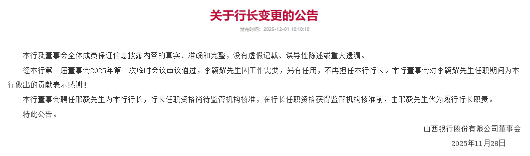 上证报中国证券网讯(记者黄坤)日前,山西银行发布关于行长变更的公告,经该行第一届董事会2025年第二次临时会议审议通过,李颖耀因工作需要,另有任用,不再担任该行行长。