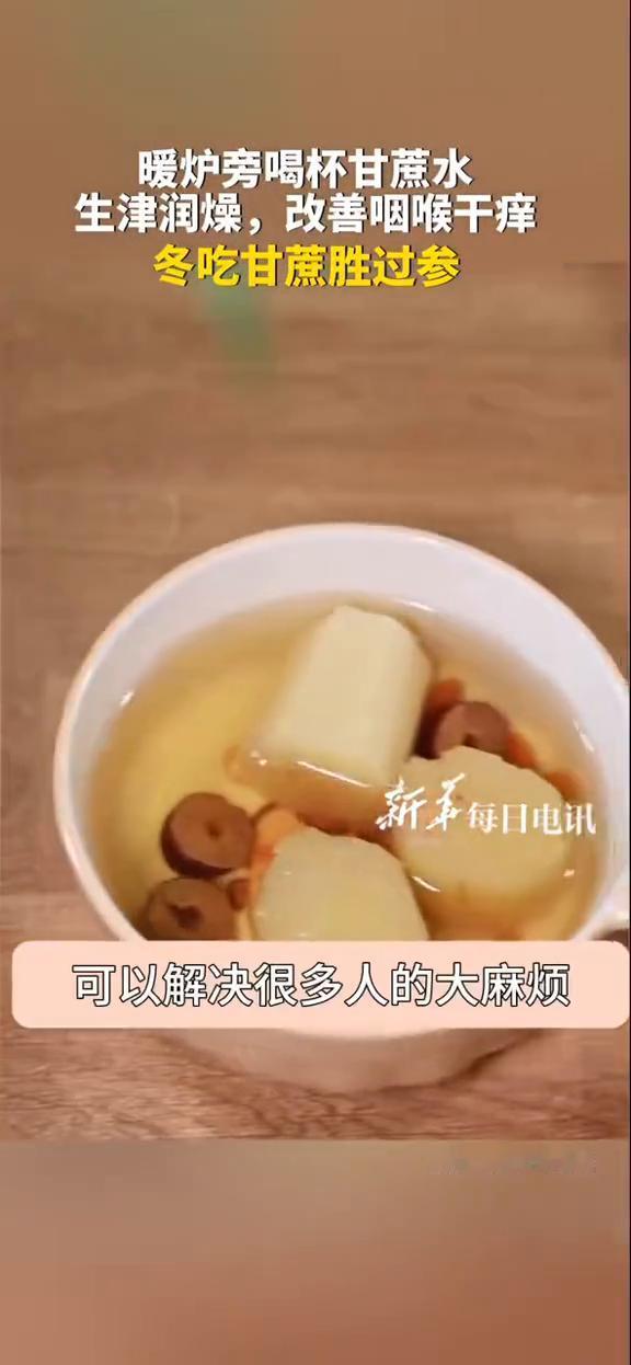 暖炉旁喝杯甘蔗水,生津润燥,改善咽喉干痒。 新华每日电讯。 冬吃甘蔗胜过参。甘蔗煮水才是冬日里的润喉王,它还被称为脾果和补血果,可以解决很多人的大麻烦。 ·甘蔗适量、去核红枣3颗、生姜2片。 ·记住这个搭配,全部倒入养生壶,加适量清水,花茶模式煮20来分钟。 煮熟之后的甘蔗水补津液的同时还温养脾胃,平时可以多给家人煮来喝一喝,就是行走的暖宝宝。 冬喝甘蔗水。甘蔗煮水治咳嗽 养胃甘蔗水 甘蔗煮水 甘蔗滋补方 甘蔗大枣陈皮饮 甘蔗大枣枸杞汤 甘蔗雪梨润燥饮