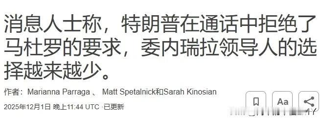 马杜罗的谈判条件,被特朗普拒绝! 路透社援引消息人士爆料,这场通话中马杜罗抛出的系列谈判条件,几乎被特朗普全盘否决,随之而来的“安全通道”到期、领空关闭,更将双方矛盾推向公开化,委内瑞拉的未来正陷入迷雾之中。 马杜罗的谈判筹码,更像困兽犹斗的挣扎。这位委内瑞拉领导人在通话中提出的诸多诉求,每一条都透着对权力的眷恋与对现实的妥协:以离开祖国为代价换取自身及家人的法律赦免,试图保留部分军事权力。 提议副总统德尔西·罗德里格斯在下次大选前组建临时政府,同时要求美国解除对委内瑞拉及多名政府官员的制裁。这些条件看似是进退有度的谈判策略,实则暴露了其内心的焦灼——既不想彻底交出权力,又希望为自己和亲信留一条后路。 但马杜罗似乎忘了,谈判的底气从来不是一厢情愿的诉求,而是手中实打实的实力。如今的委内瑞拉,经济凋敝、民生困顿,外部面临美国的严厉制裁,内部凝聚力逐渐涣散,他手中能打的牌早已所剩无几。 特朗普的强硬拒绝,尽显商人政客的功利算计。面对马杜罗的条件,他不仅大多予以驳回,还给出了最后通牒:一周时间,带着家人离开委内瑞拉。 这条所谓的“安全通道”已于11月28日正式到期,紧接着特朗普便宣布关闭委内瑞拉领空,一系列操作快准狠,不给对方任何周旋的余地。特朗普为何如此咄咄逼人?答案早已写在他的政治诉求里。 眼下,他正急于将针对委内瑞拉的“禁毒战争”打造成自己的亮眼政绩,以此为竞选之路增添砝码。在这样的逻辑下,马杜罗必须成为他的“垫脚石”——只有马杜罗彻底下台、狼狈流亡,才能凸显特朗普的“大获全胜”,才能向选民证明他的强硬手腕“行之有效”。 这场谈判的破裂,早已埋下伏笔。马杜罗的误判在于,他以为还能凭借残存的权力与特朗普讨价还价,却没看清自己早已身处绝境。委内瑞拉的局势走到今天,固然有外部制裁的冲击,但马杜罗政府自身的治理失当难辞其咎。 经济政策的失误导致通货膨胀居高不下,民生问题日益严峻,民众的不满情绪不断累积,这些都让他的统治基础愈发薄弱。而特朗普恰恰抓住了这一点,一边加大外部施压,一边渲染马杜罗政府的“负面形象”,一步步压缩其生存空间。 更值得深思的是,这场博弈的背后,是美国长期以来对拉美地区的干涉野心。从历史上看,美国从未放弃过对“后院”的控制,通过扶持代理人、实施经济制裁、甚至发动军事干预等手段,不断插手拉美国家内政。 此次针对委内瑞拉,特朗普政府的意图昭然若揭:不仅要推翻马杜罗政府,更要在拉美地区树立“顺我者昌,逆我者亡”的霸权标杆,巩固其在该地区的影响力。 但时代早已不同,拉美国家的民族意识不断觉醒,国际社会对霸权主义的反对声音日益高涨。特朗普的强硬手段或许能逞一时之快,却无法从根本上解决问题,反而可能引发更大的地区动荡。 马杜罗寻求第二次通话的努力,更像一场无望的挣扎。在特朗普已经关闭谈判大门、步步紧逼的情况下,即便双方再次对话,结果恐怕也难以改变。 特朗普要的是马杜罗的彻底垮台,马杜罗却不愿轻易放弃权力,两者之间的核心矛盾无法调和,谈判自然难有突破。更何况,特朗普的政治日程表早已排定,他需要的是快速见效的“政绩”,而非漫长的谈判拉锯。 对于马杜罗而言,此刻的每一分拖延,都可能让自己陷入更不利的境地。这场危机给世界带来的启示,远比事件本身更深刻。它再次证明,霸权主义始终是世界和平与稳定的最大威胁,任何将他国当作政治筹码的行径,都终将遭到国际社会的谴责。 同时,它也警示各国,一个国家的稳定与发展,关键在于自身的治理能力,只有切实解决民生问题,赢得民众的支持,才能在复杂的国际局势中立于不败之地。马杜罗的困局,既是个人决策失误的结果,也是委内瑞拉长期积累的矛盾的集中爆发,这对于其他国家而言,无疑是一记沉重的警钟。 委内瑞拉的未来何去何从?目前尚难预料,但可以肯定的是,特朗普的强硬干预绝不会带来真正的和平与稳定。如果美国继续一意孤行,强行推动“政权更迭”,只会让委内瑞拉陷入更大的混乱,民众将承受更多苦难。 而马杜罗如果不能认清现实,及时调整策略,恐怕也难以摆脱失败的命运。历史的车轮滚滚向前,霸权主义的行径终将被时代所唾弃。 委内瑞拉的局势再次提醒我们,各国的主权和领土完整必须得到尊重,各国人民有权自主选择自己的发展道路,任何外部势力都无权干涉。 希望国际社会能够秉持公平正义,共同反对霸权主义,为委内瑞拉局势的和平解决创造有利条件,让这个饱受苦难的国家早日恢复稳定与安宁。否则,任由霸权横行,不仅会让委内瑞拉民众深陷困境,也将给整个国际秩序带来不可预测的风险