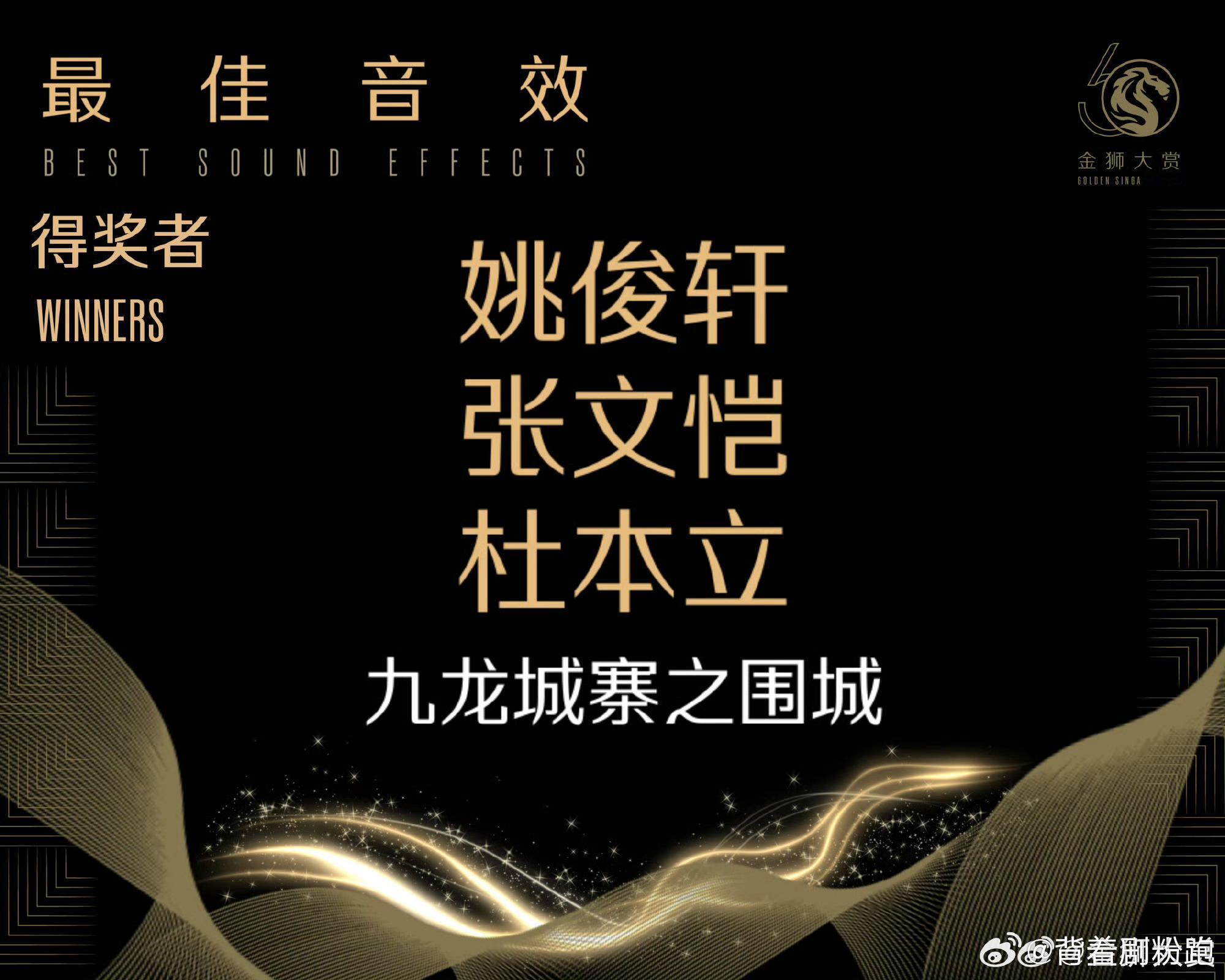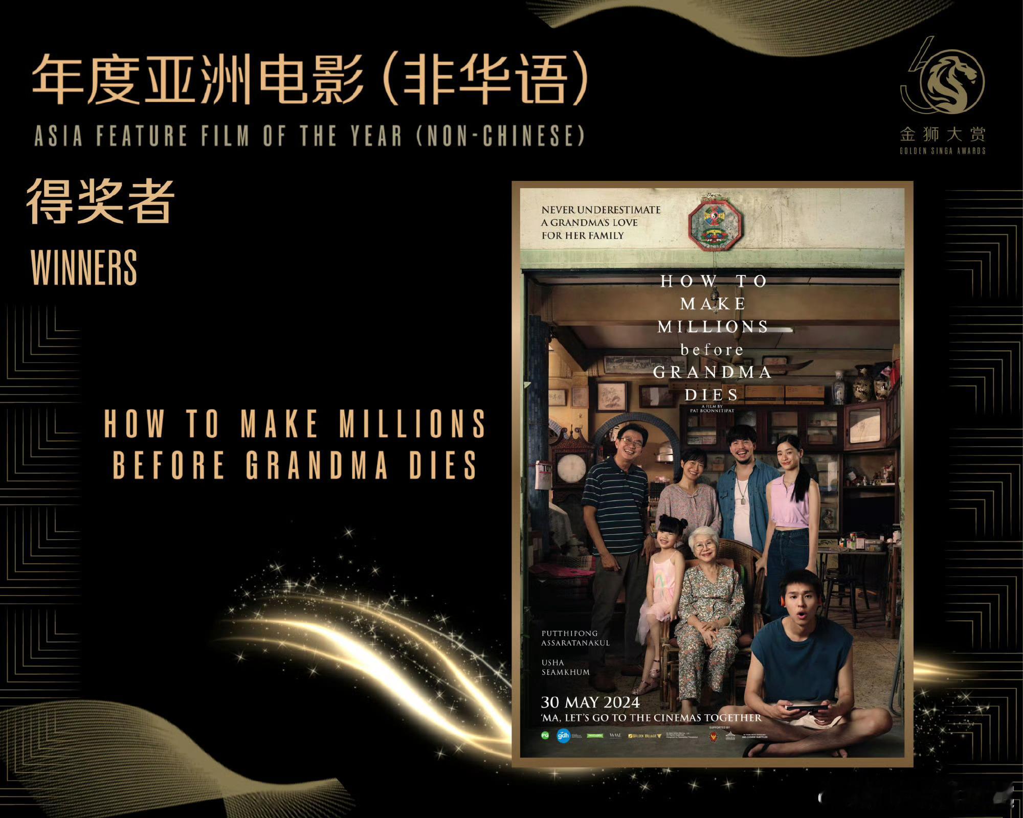 首届新加坡国际华语电影金狮大赏奖项🈶,恭喜宋佳最佳女主,恭喜钟楚曦最佳女配最佳电影:《破·地狱》最佳导演:翁子光、区焯文《爸爸》最佳男主角:刘青云《爸爸》最佳女主角:宋佳《好东西》 最佳男配角:朱柏康《破·地狱》最佳女配角:钟楚曦《好东西》最佳新人:李珞桉《不说话的爱》最佳摄影:郑兆强《九龙城寨之围城》最佳剧本:翁子光《爸爸》最佳视觉效果:许明军《唐探1900》最佳原创电影音乐:丁可《爸爸》最佳原创电影歌曲:《普渡众生》(《破·地狱》)最佳音效:姚俊轩、张文恺、杜本立《九龙城寨之围城》最佳剪辑:石缮荥《爸爸》最佳美术设计:麦国强、周世鸿《九龙城寨之围城》最佳造型设计:张世杰《唐探1900》最佳动作设计:谷垣健治《九龙城寨之围城》年度亚洲电影(非华语):《姥姥的外孙》