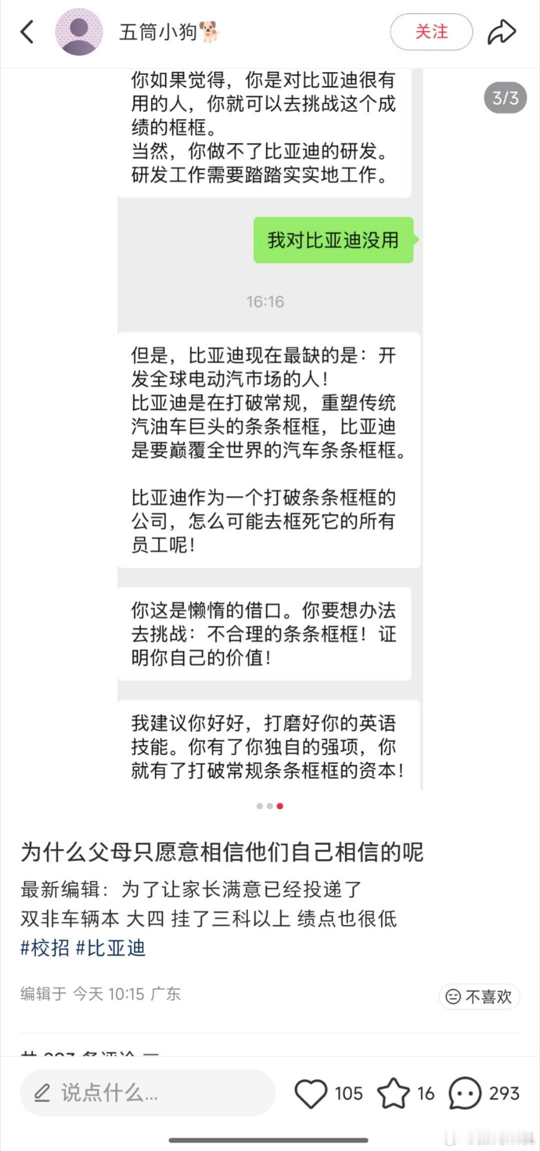 博主普通大学,绩点低,挂科多,但父亲坚持让他给比亚迪投简历。这位父亲对比亚迪的印