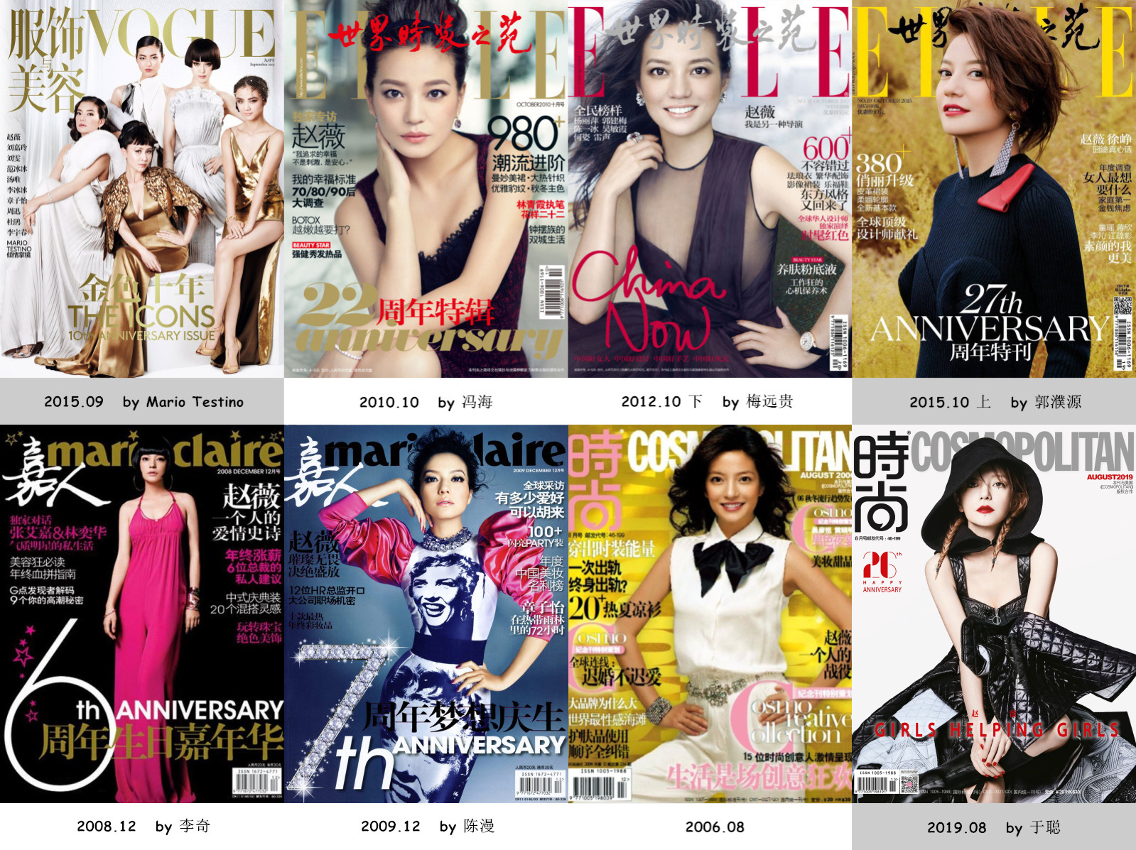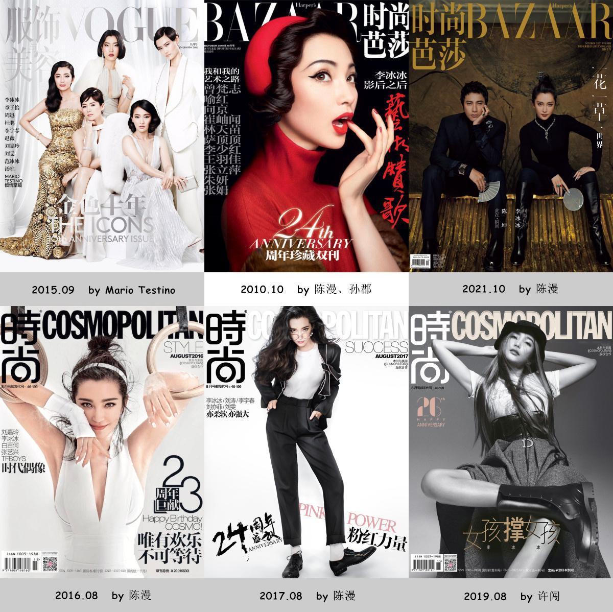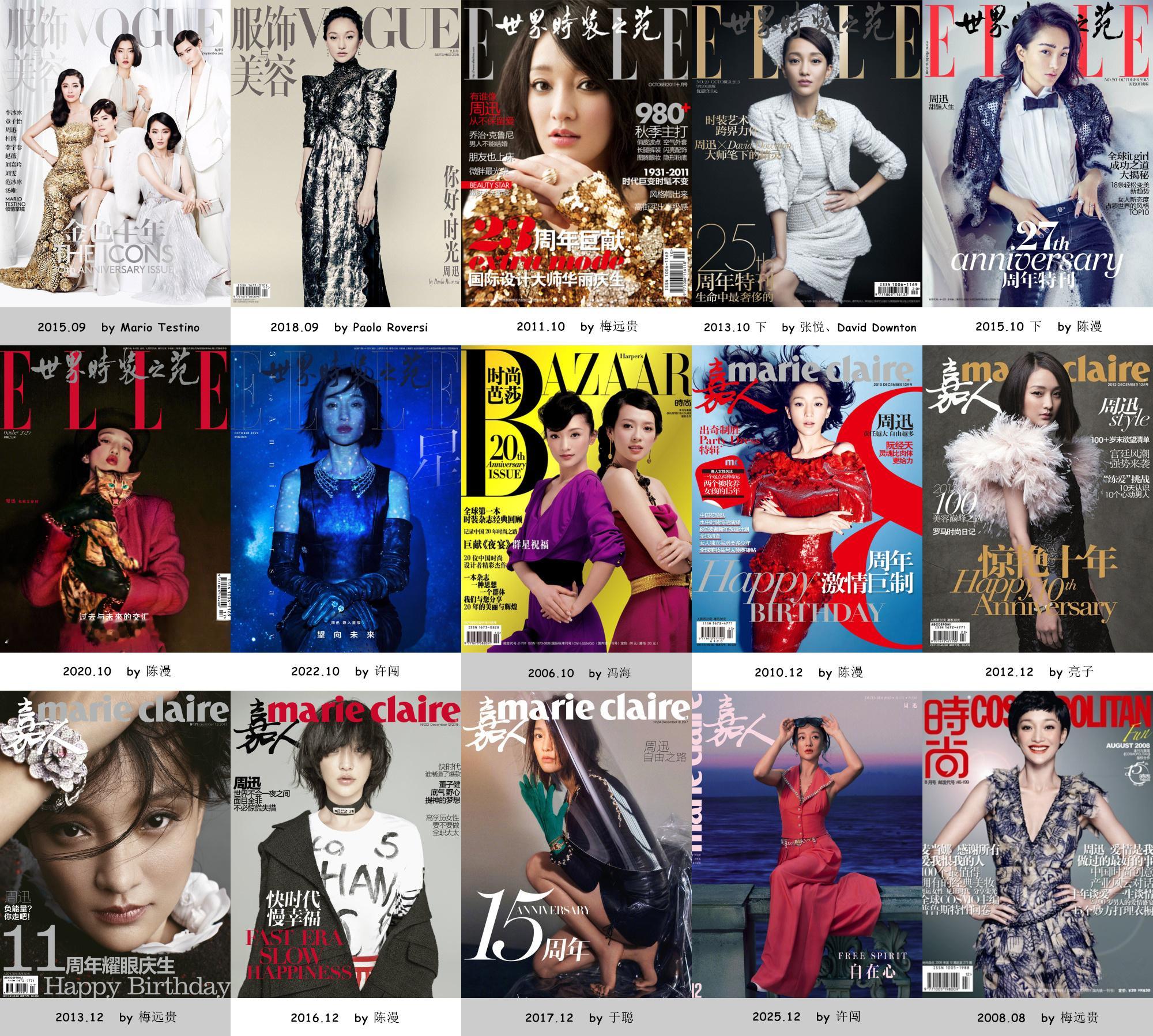 【专题】 — — 五大女刊 「周年刊」 名人刊数统计 二十一刊 :章子怡 十五刊 :周迅 八刊 :薇薇七刊 :冰冰 六刊 :李冰冰 五刊 :巩俐 、舒淇 、李宇春 四刊 :倪妮 、井柏然 三刊 :张曼玉 、王菲 、周冬雨 、刘亦菲 仅统计三刊及以上数量 .