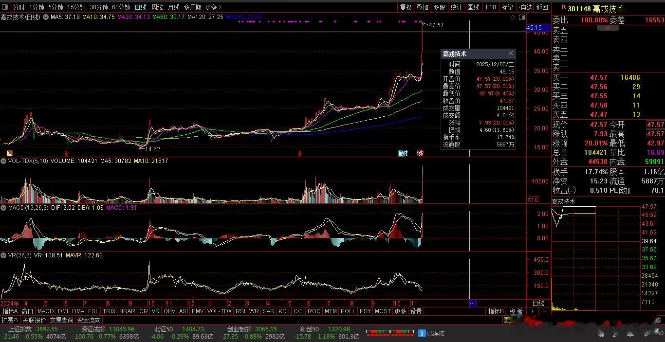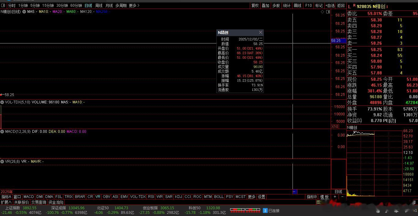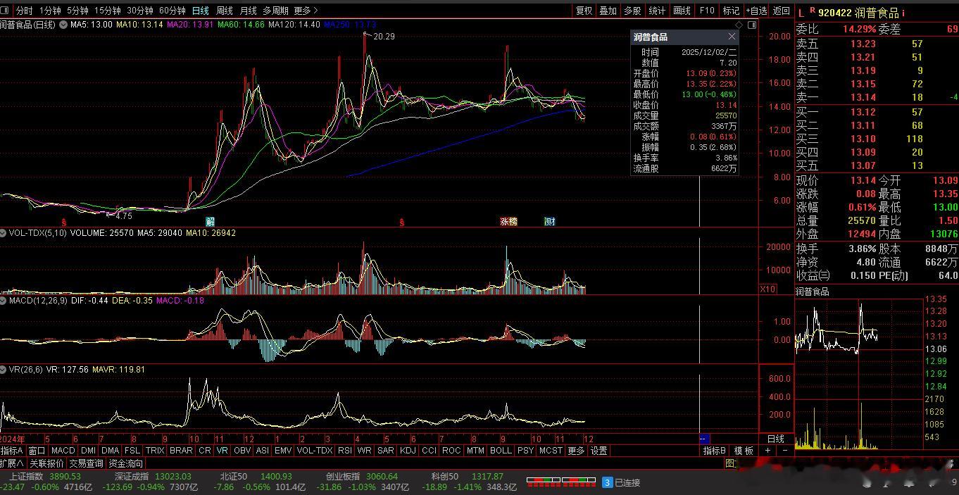 【财富晚茶】午盘透析(12.02):北证跌幅0.29%:渔业反弹电机回调导语:作者系《网易号》优质财经领域创作者。曾经原创作者和知名网易号旅游领域创作者。大跨度行业等的写作,颇受网友喜爱。作品发表于2025.12.02.12:18 优雅端庄晚风。(标题作品全球证明渔场:日本北海道渔场)【内容概述】今日股市午评:截止11:30:沪指:贡献1根阳线1阴线。深指:贡献1根阳线1阴线。沪指跌破:阻力位:03914点。沪指跌破:支撑位:03890点。深指突破:阻力位:13149点。深指突破:支撑位:12993点。追寻盘面:沪深高开拉升兑现,尾盘主力巨资拉升。一、透析市场:风口公司,上下起伏920422 润普食品 盘中 -01涨1、突破三年箱顶视野盘面:前期双顶,杀跌企稳:2025-12-02 截至11:30:股价报收:13.15元。股指上涨:0.69%。成交总量::25647手,成交金额:3377万元。总换手率3.87%,观总市值:11.62亿元。流通市值:8.69亿元。2、食品添剂翘楚主营业务:食品添加剂的研产和销售。公司品牌:健康食品配料行业头部品牌。3、营收减净利优业绩好转:2025-09-30 三季度报:公司营收:3.6441亿 同比增-0.77%。公司净利:1363.0932万 同比增87.10%。二、沪深绿盘:空方强势,悲剧股市今天目击:沪深北市:早盘:低开三跌,五涨二跌。尾盘:二涨五跌,次低绿盘。看点之一:沪深北指:股指低开:盘中震荡,瞬间下探。看点之二:一只乌鸦:科创50指:跌幅超1%。看点之三:沪深北市:半日成交:10562亿元。盘面追踪:3983股飘绿。三、沪深阴棒:个股弱势,亏钱效应沪深追踪:截至午间:市场收盘:沪指跌0.55%报3892.55点,深指跌0.77%,创指跌0.88%,北证50指跌0.29%,沪深北市:10562亿元。四、盘面观察:林业脉冲,电机回调1、板块扫描透析沪深板块:板块走强:林业、零售、煤炭、保险等。板块走低:电机、有色、传媒、半导体、券商、医药、汽车等。概念活跃:福建本地股、海南自贸等。2、个股涨跌起伏沪深北市:多空遭遇。1303股票上涨,72涨停板。3983股票下跌,5股跌停板。沪深北市:合计成交:10562亿元。午盘视野:沪深低开弱势杀跌,尾盘溃败筹码恐慌。五、沪深涨跌:三甲前茅,安不忘危1、今日涨幅谁家主旋律:天经地义:风口股票涨停板920035 N精创300269 联建光电301148 嘉戎技术第一、涨幅榜眼排行榜-1:920035 N精创主营业务:冷链设备智能控制器-医药与食品冷链监测记录仪等研产和销售。公司品牌:冷链温湿度控制市场份额中国市场第一全球市场前列。排行榜-2:300269 联建光电主营业务:LED高端显示设备及显控系统研产和销售。公司品牌:国内中高端LED全彩显示应用行业的领军企业。排行榜-3:301148 嘉戎技术主营业务:膜分离装备-高性能膜组件-高浓度污废水处理的研产和销售。公司品牌:全球领先的膜技术公司。第二、综评榜技术看盘-1:920035 N精创。潜力股票-1:920035 N精创:冷链温湿度控制市场份额中国第一全球市场前列。风险股票-1:暂时没有:即无301092 争光股份。2、今日跌幅谁家主旋律:摇摇欲坠:弱势股票涨停板688260 昀冢科技300344 *ST立方601872 招商轮船跌幅榜-1:688260 昀冢科技主营业务:精密电子零部件的研产和销售。公司品牌:摄像头光学模组CCM-音圈马达VCM精密电子零部件民营领先企业.跌幅榜-2:300344 *ST立方主营业务:智能软硬件-数字化智能的研产和销售。公司品牌:新型数字基础数字科技云服务商。跌幅榜-3:601872 招商轮船主营业务:油气运输-干散货运输。公司品牌:世界一流航运企业。六、创作不易:优质网易,财经作者投资投机迷茫之中:给予尽可能有帮助:资本市场风险自负。(优雅端庄晚风《网易号》财经领域创作者和原创作者 违者必究)