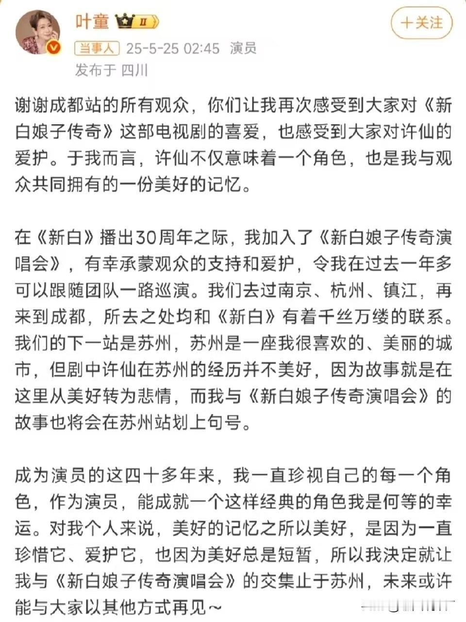 还记得《新白娘子传奇》里反串许仙的叶童吗?当年她演的许仙,是多少人刻在DNA里的童年回忆!可最近才知道,剧组去年原本要办30周年演唱会,结果黄了——全因叶童退出了!她之前连续好几年都参加剧组小聚,那是真·叙旧;后来有人想把重聚搞成商演捞金,还扯出利益分配矛盾,叶童看不下去直接走了,直言“回忆杀变味成生意经”!多少经典被拿来炒情怀换钱?就像老生意经说“信誉是种子”,可现在有些人为赚快钱,把观众的情怀当“货”卖——当年看剧哭鼻子的我们,现在看到情怀变生意,心里都堵得慌!经典该在回忆里发光,不是被架在商演台上数钱!叶童这波,我挺她!