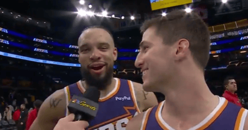 赛后接受采访时,狄龙-布鲁克斯冲着队友科林-吉莱斯皮喊道:“小恶棍,小恶棍,干得漂亮,我的小伙子!”