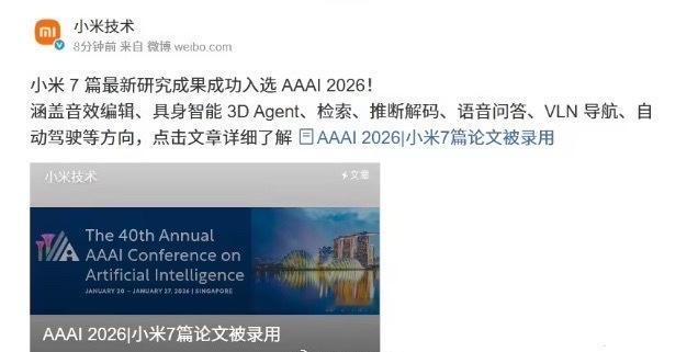 人民日报谈小米集团高质量发展小米分享7篇最新研究成果 从玄戒芯片到6G原型机,从智能工厂到AAAI顶会入选,小米的高质量发展逻辑清晰:以五年超两千亿研发为基,以AI、通信、智造为翼。7篇新成果的落地,让"中国造"彻底摆脱低价标签,彰显技术驱动的全球竞争力。AI芯片AI智能小米