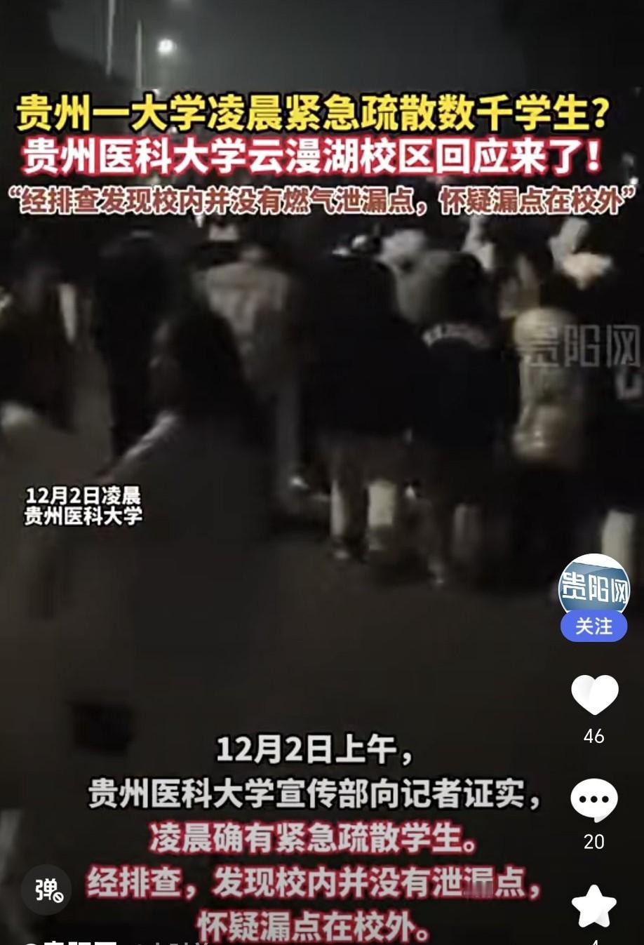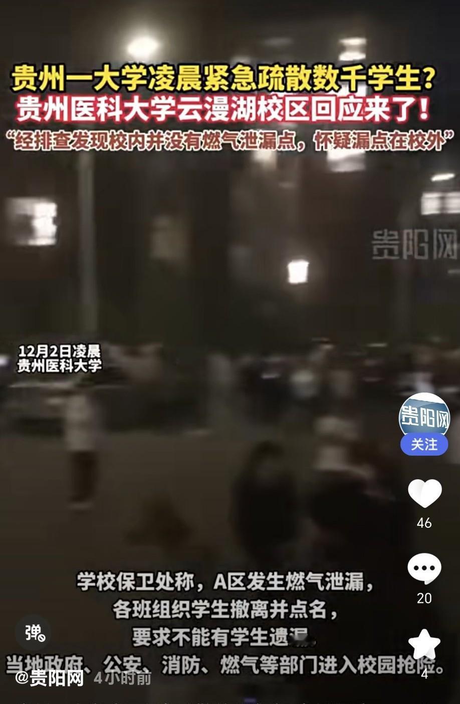 数千学生紧急撤离宿舍,幸好只是虚惊一场 12月2日凌晨,贵州医科大学云漫湖校区数千学生紧急撤离宿舍。多个信源说,0点左右宿舍A区满是刺鼻燃气味。学校赶紧组织学生撤离,还开放礼堂、图书馆让学生过夜。保卫处称A区疑似燃气泄漏,之后各部门都来抢险,排查后发现校内没泄漏点,怀疑在校外。校医院称是一食堂燃气泄漏,A区都能闻到味儿,清晨6时空气甲烷含量达标学生才回宿舍。 燃气泄漏真吓人,及时疏散学生都安全。 干的不错,这种事宁可小心、麻烦一些,也不能不管不顾,万一真是学校燃气泄漏,出了事故,学生没疏散就太可惜了。没有出问题更好,出了事就什么都来不及了!学校给力,反应快,处理及时,虚惊一场,当做一次突发的逃生演练也是不错的!大家都平平安安的就好。 目前当地还在周边排查,希望能尽快查明真相,让大家都安心。