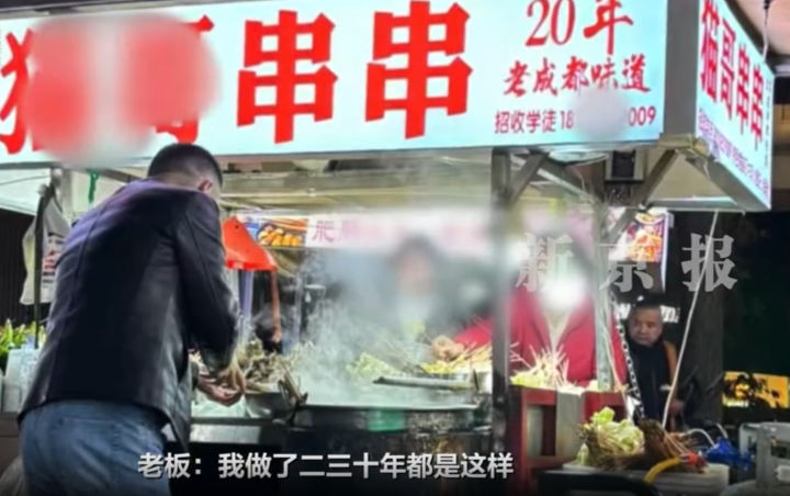 12月2日,有到成都游玩的游客发布视频称,发现春熙路商圈小吃街有一家串串摊贩回收客人用过的锅底重复使用。