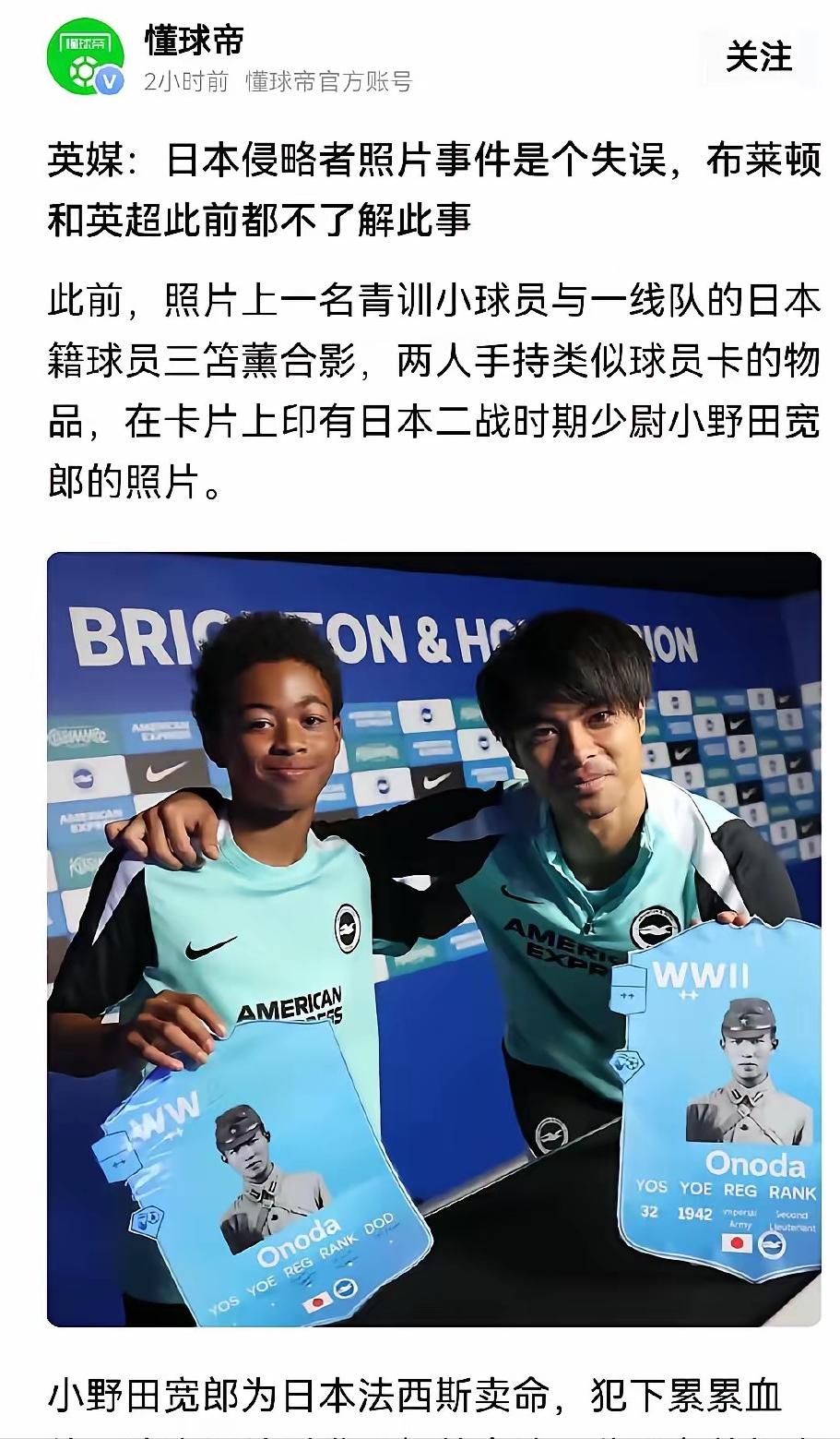 你们谁见过德国人穿着帝国的旗帜,大摇大摆地登台走秀?谁敢想,德国国脚举着党卫军军官照片在英超赛前合影?如果那样,西方的社交平台,会如何处理德国人?世界各国媒体会如何报道这些信息?犹太人会如何处置这照片上的每一个人? 最近英超赛场上的一张合影,把一个让人心里堵得慌的问题摆到了台面上。日本国脚三笘薰和青训小球员拿着二战日军军官小野田宽郎的照片合影,这张照片还被俱乐部官方发了出来,引发了不少争议。 让人费解的是,除了中韩网友的愤怒和俱乐部轻飘飘的一句道歉,西方世界几乎没什么大动静,社交平台没下架、主流媒体没声讨,仿佛这只是个无关紧要的小失误。 要是把场景换一换,后果不堪设想。试想一下,要是德国球星举着党卫军军官的照片公开亮相,西方世界会是什么反应? 恐怕不用等网友发酵,社交平台早就主动下架内容、封禁账号了,各大媒体会铺天盖地地口诛笔伐,把这定性为严重的历史倒退,犹太人团体更会追着不放,要求严肃追责,相关球员和俱乐部大概率会身败名裂,付出惨痛的代价。 纳粹符号在西方是碰不得的红线,这是全世界都公认的底线。 可到了日本军国主义符号这里,这条底线就变得模糊不清了。 就说这次的小野田宽郎,可不是什么普通士兵,他在菲律宾卢邦岛滞留近三十年,期间杀害了30名平民,手上沾着无辜者的鲜血,这样的战犯竟然被当成“英雄”一样被追捧,还出现在英超的官方活动中。 让人无语的是,俱乐部道歉时只提了“向中国造成的冒犯”,连韩国都被忽略了,而且一句“失误所致”就想把事情翻篇,完全没意识到问题的严重性。 类似的双标早就不是第一次了。之前东京奥运会期间,“旭日旗”能不能进赛场引发过激烈争议,韩国政府和民众强烈反对,认为这面旗帜就是日本军国主义的“战犯旗”,和纳粹旗帜没区别。可国际奥委会和东京奥组委却态度暧昧,说这面旗“不含有政治含义”,最终也没明确禁止。 要知道,亚足联之前都因为有球队悬挂“旭日旗”罚过款,到了奥运会这个更大的国际舞台,反而没人敢较真了。 再往前想,2001年赵薇的“军旗装事件”也让人印象深刻,当时她穿着印有旭日旗图案的衣服拍杂志,引发了全国上下的愤怒,南京大屠杀幸存者都站出来发声抗议,最后赵薇多次公开道歉,相关策划人也引咎辞职。 可在国际上,这样的事情却常常被淡化处理。 西方媒体总爱拿历史问题指责别人,却对日本的历史修正主义视而不见,甚至刻意回避。 这种双标背后,藏着复杂的原因,但最核心的还是对历史的态度问题。 德国从二战后就一直在认真反思历史,主动清算纳粹余毒,赢得了世界的尊重。而日本却一直在回避历史、美化侵略,把战犯当成英雄供奉,还不断试图淡化战争罪行。 西方世界因为地缘政治等原因,对日本的行为睁一只眼闭一只眼,甚至刻意纵容。 历史不是任人打扮的小姑娘,每一个军国主义符号的出现,都是对战争受害者的二次伤害。 无论是纳粹旗帜还是旭日旗,都是侵略和暴行的象征,都应该被坚决抵制。西方世界不能再搞双重标准了,不能因为立场不同就选择性失明。只有正视历史、尊重历史,才能避免悲剧重演,这是全世界都应该遵守的底线,谁也不能例外。