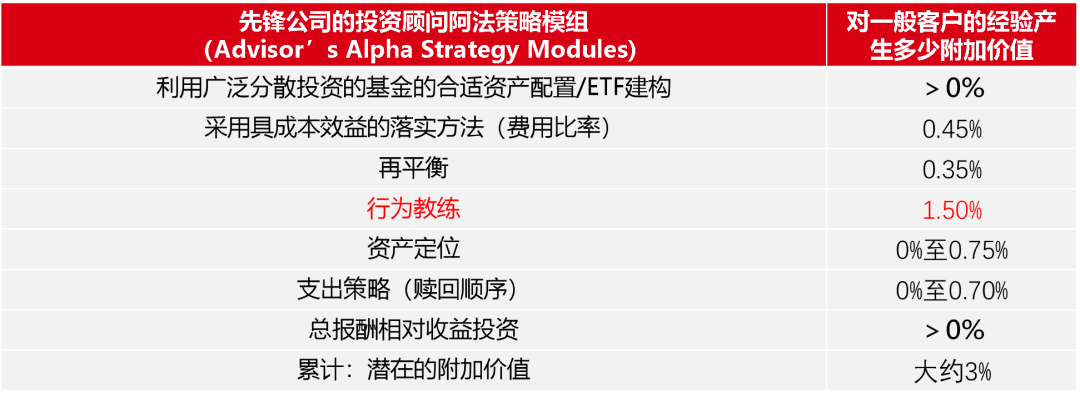 进一步分析,理财师创造超额收益的来源主要有三类:一是战略资产配置(SAA),包括资产配置方案、ETF构建和组合再平衡;二是战术资产调整(TAA),涉及费用控制、资产定位及赎回策略;三是行为引导服务,即日常投教与陪伴。值得注意的是,这3%中约有一半来源于“行为教练”功能,说明投教和陪伴的重要性不亚于资产配置本身。若缺乏这一环节,理财师的服务价值将大打折扣。
