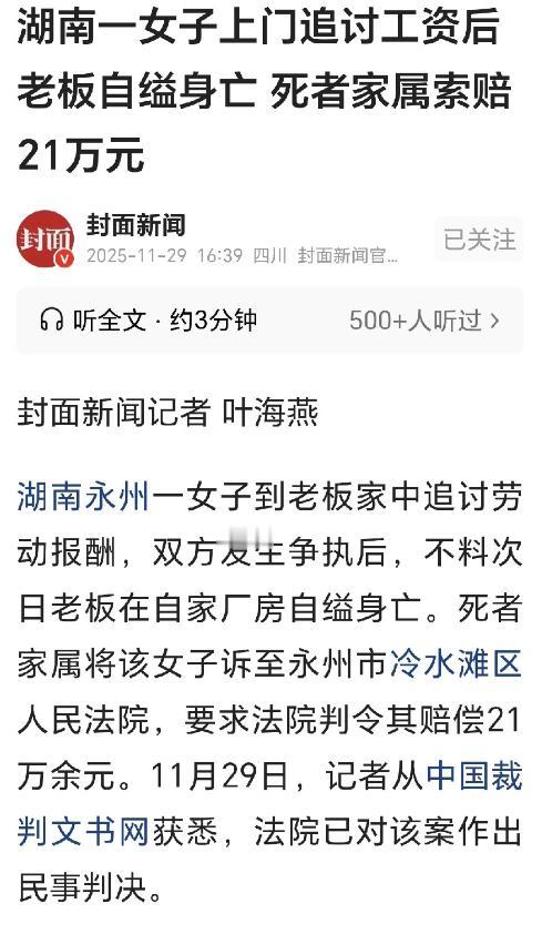 自食恶果!11月26日报道,湖南永州,一女子被欠薪20000元,5年过去,老板就是不肯给她,女子忍无可忍,上门讨薪,与老板夫妻发生了争吵,万万没有想到,老板第二天自缢身亡,家属认为,是女子讨薪刺激了老板,这才导致老板轻生,家属告到法院,索赔21万,法院判了! 湖南永州的况女士真没想到,自己只是去讨回被拖欠的工资,竟然闹出了人命官司。 2017年况女士入职老板李先生合伙开的教育机构说起,况女士勤勤恳恳工作,虽然没签劳动合同,但一直兢兢业业。 可从2020年开始,她的工资就断断续续没着落,到她2025年离职时,累计被拖欠了两万多块。 这钱虽然不算多,但都是她的血汗钱,五年来,她找过老板无数次,老板要么推脱,要么直接失联,就是不肯发工资。 忍无可忍的况女士终于在2025年3月2日提前打电话通知李先生,上门讨薪,可一见面,双方就为工资问题吵了起来,李先生和妻子态度强硬,根本不提给钱的事。 争执越来越激烈,况女士怕出事,直接报警,民警到场后安抚情绪,确认只是口头争吵,没有肢体冲突,让双方自行协商后就离开了。 谁也没想到,第二天一早,李先生就被家人发现自缢在自家厂房,悲痛之下,家属把矛头指向了况女士,声称她“逼死”了李先生,还说她私闯民宅、辱骂、抢财物、逼签抵押协议,甚至动手伤人。 于是,把她告上法院,索赔死亡赔偿金和精神抚慰金,共21万多元。 面对指控,况女士又委屈又害怕,她解释自己只是合法讨薪,没辱骂、没动手,还提交了关键证据:电话录音显示李先生早就有“活着没意思”的消极言辞,医院病历显示他曾得脑梗,长期抑郁,正在接受治疗。 况女士说,当天争吵只是讨薪未果,她报警也是为了理性解决问题,全程没越界。 法院审理后查清楚整个事情:况女士与教育机构存在事实劳动关系,被欠薪铁一般的事实,她提前打电话沟通后上门讨薪,属于合法维权,主观上没有害人意图。 警方出警记录也明确写着“无肢体冲突”,家属说的抢财物、动手等都没有证据支撑,更关键的是,李先生作为完全民事行为能力人,长期抑郁、厌世,自杀是他自主决定的行为,与况女士讨薪没有法律因果关系。 法院作出判决:驳回原告全部诉讼请求,李先生死亡后果由其自行承担,法院还指出,企业长期拖欠工资、管理混乱,才是矛盾激化的重要原因。 判决一出,网友纷纷点赞:“欠薪本来就理亏,讨薪合法,不能让受害者背锅”“抑郁和自身压力才是根本原因”“要是这样都能索赔成功,以后谁还敢讨回工资?” 况女士虽然洗清了冤屈,但被拖欠的两万工资仍需通过劳动仲裁等方式追讨,这件事提醒大家:欠薪维权一定要走合法途径,保持理性,不越界;企业也必须守法经营,按时足额发工资,否则小矛盾可能酿成大悲剧。 说到底,况女士只是想拿回自己的劳动报酬,五年的等待和委屈已经够多了,她不应该为老板的极端行为买单。 法院的判决不仅守住了法律底线,也给所有被欠薪者一颗定心丸:合法维权不用怕,正义总站在有理的一方。 希望这个案例能让更多拖欠工资的老板警醒,也让更多劳动者敢于用法律保护自己的权益。 对此你怎么看? 信源:直播海南